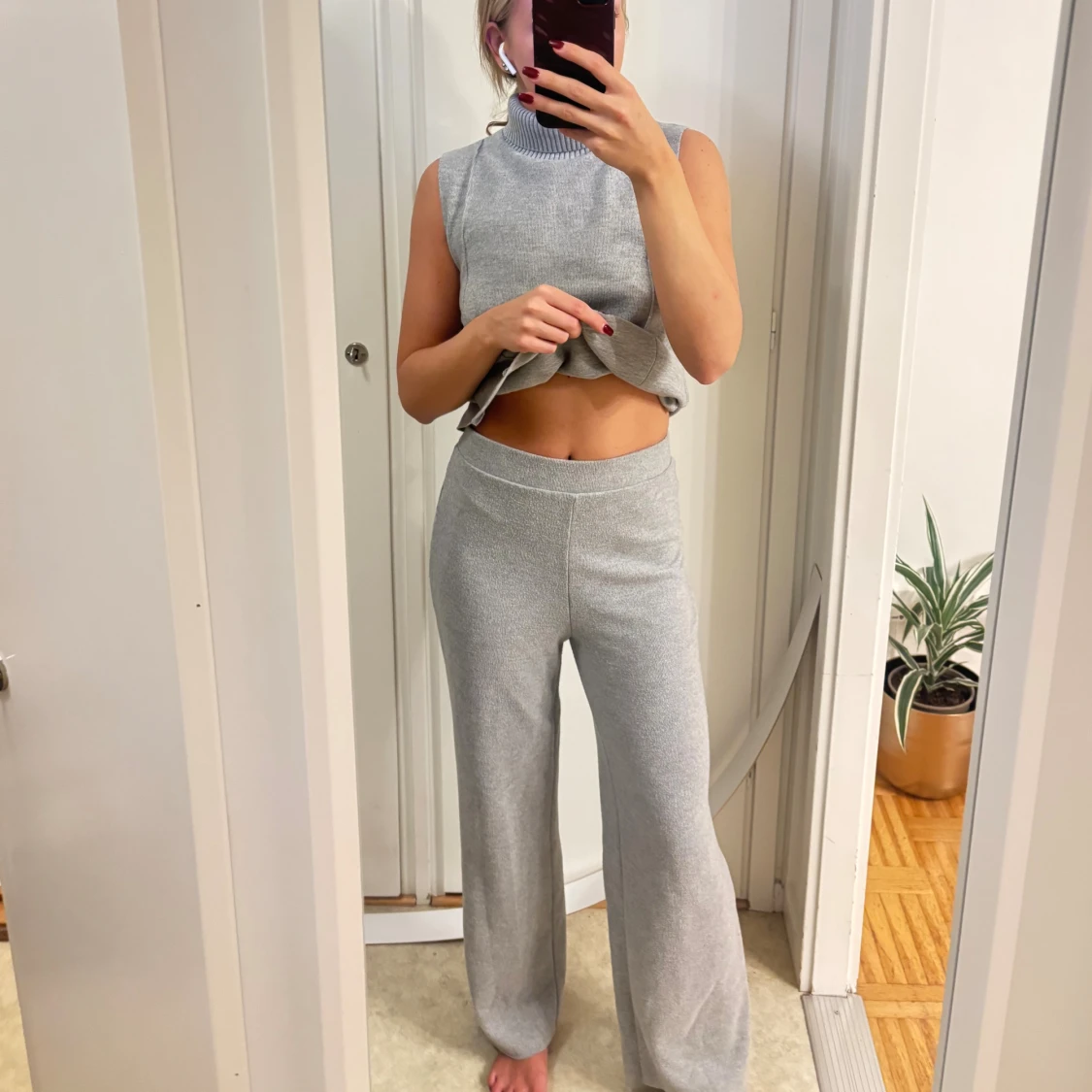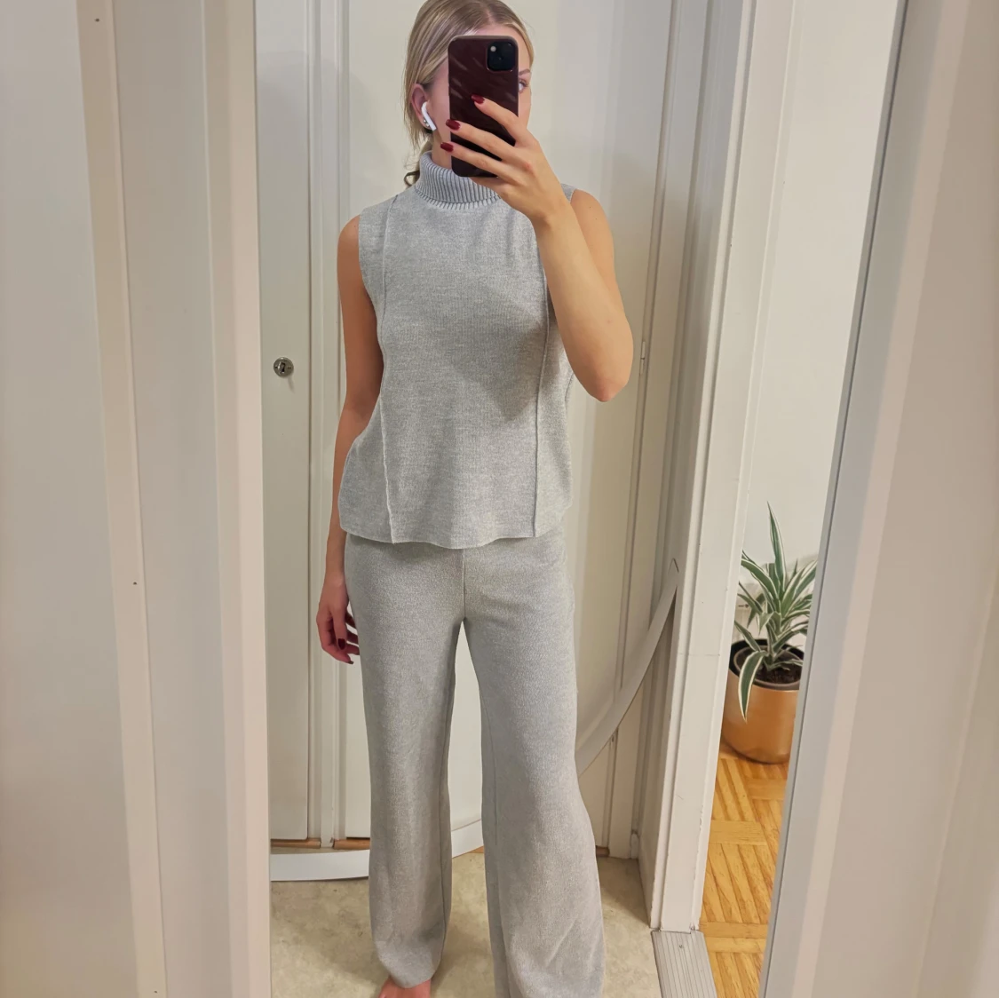 Gråa stickade byxor med matchande tröja från Zara i storlek S. Använd en gång jättefin och skön