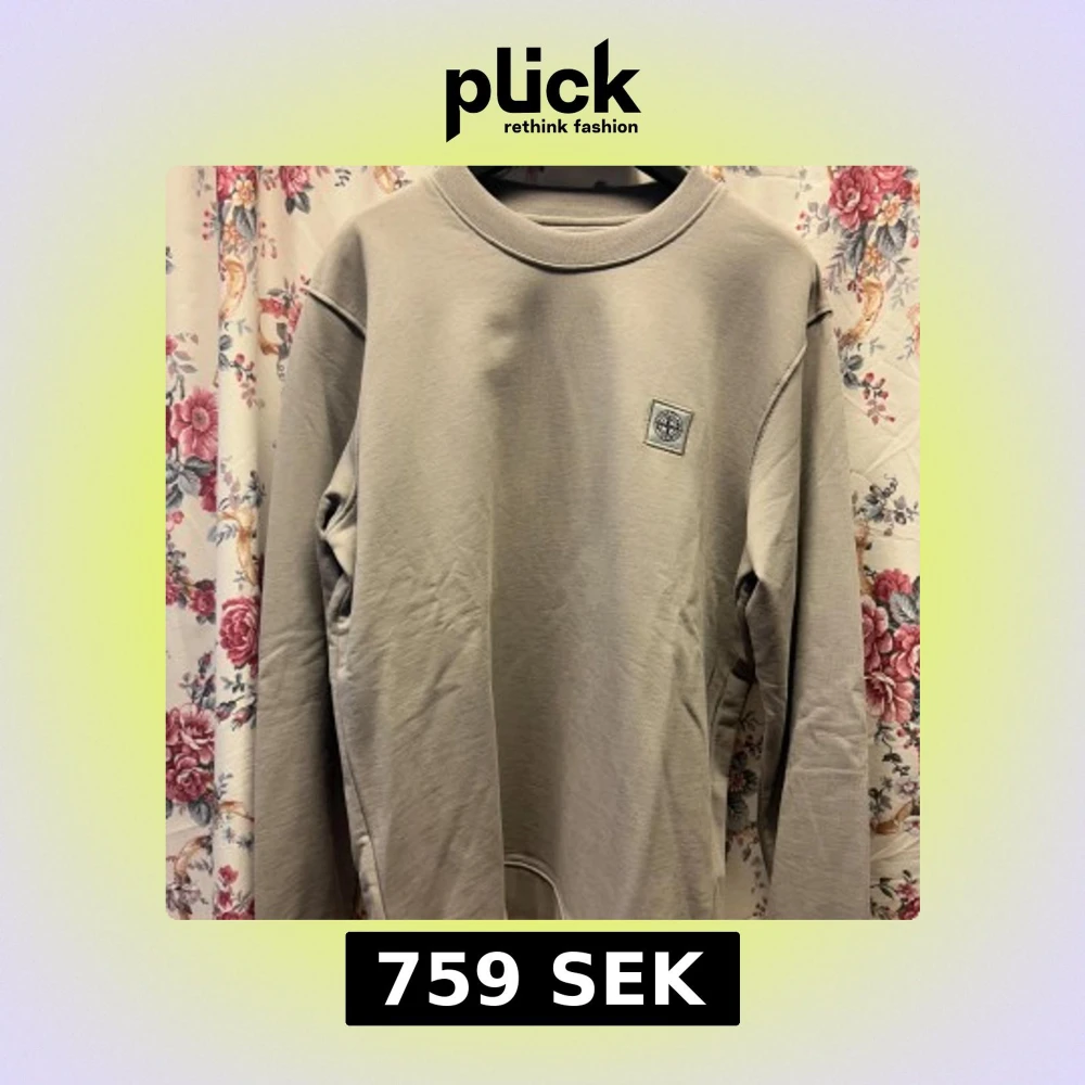 Säljer en grå sweatshirt från Stone Island med rund hals och diskret logotyp på bröstet. Tröjan har långa ärmar och är tillverkad i mjuk bomull, perfekt för en stilren och avslappnad look.
