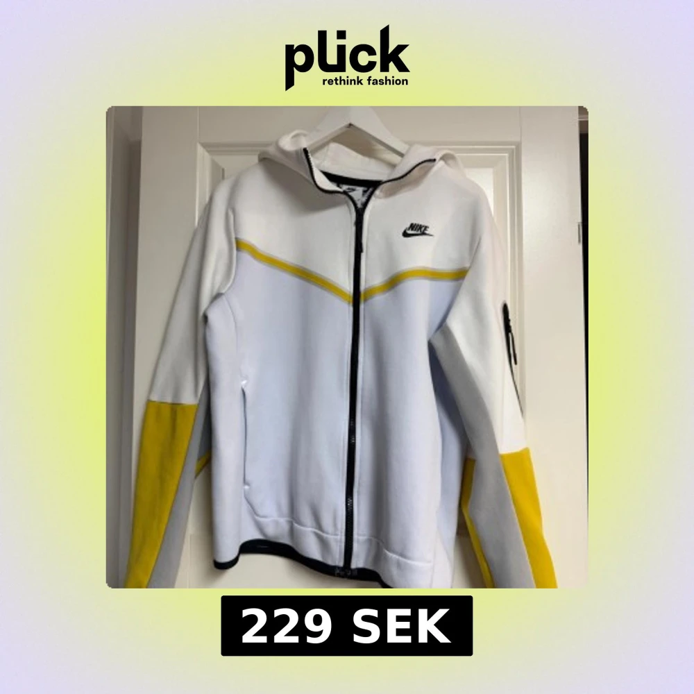 Nike Tech hoodiejacka i vitt, ljusgrått och gult med svart logga på bröstet. Jackan har hel dragkedja, huva och en cool detaljficka med dragkedja på ärmen. Tillverkad i mjuk bomullsmix, perfekt för en sportig och avslappnad stil. Finns några små fläckar på ena armen (se bild)