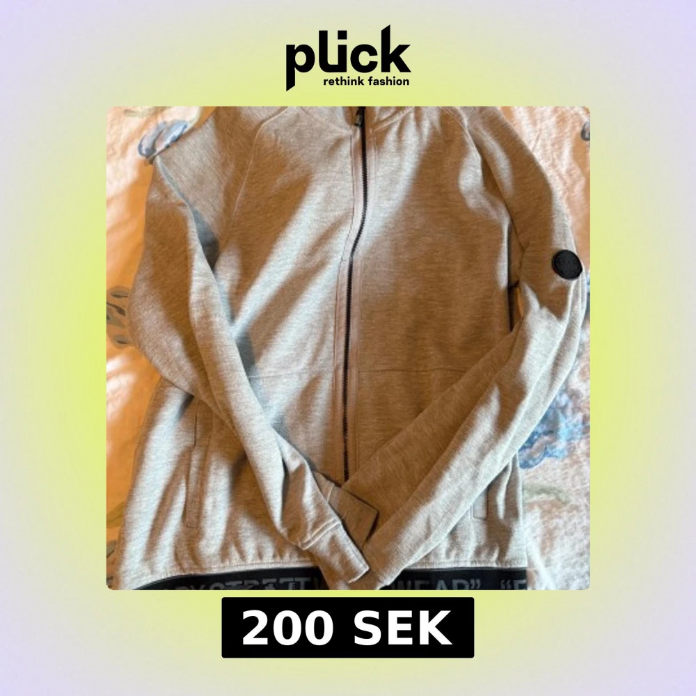 Säljer en grå hoodie från Bershka med dragkedja framtill och huva. Jackan har långa ärmar, två fickor och en svart detalj på ena ärmen. Perfekt för en avslappnad stil.