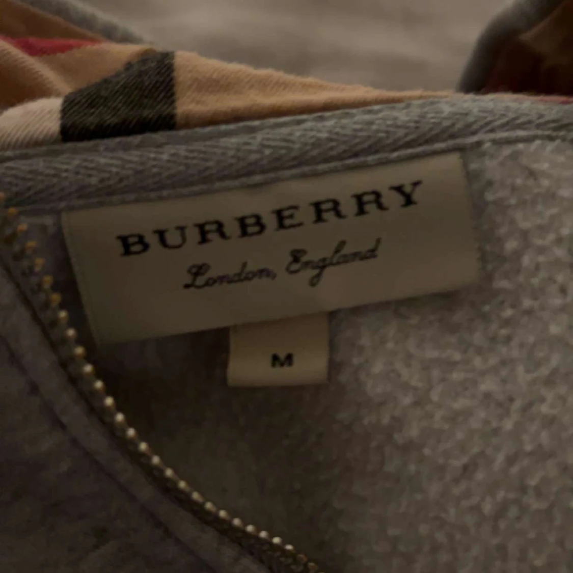 Grå hoodie från Burberry med dragkedja och klassiskt rutigt mönster i huvan. Broderad logga på bröstet och två stora fickor framtill. Perfekt för vintern.