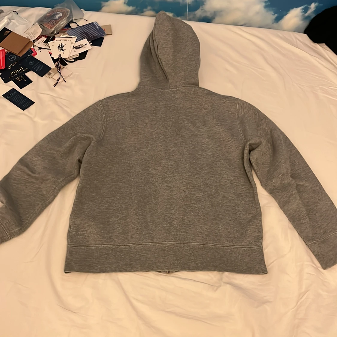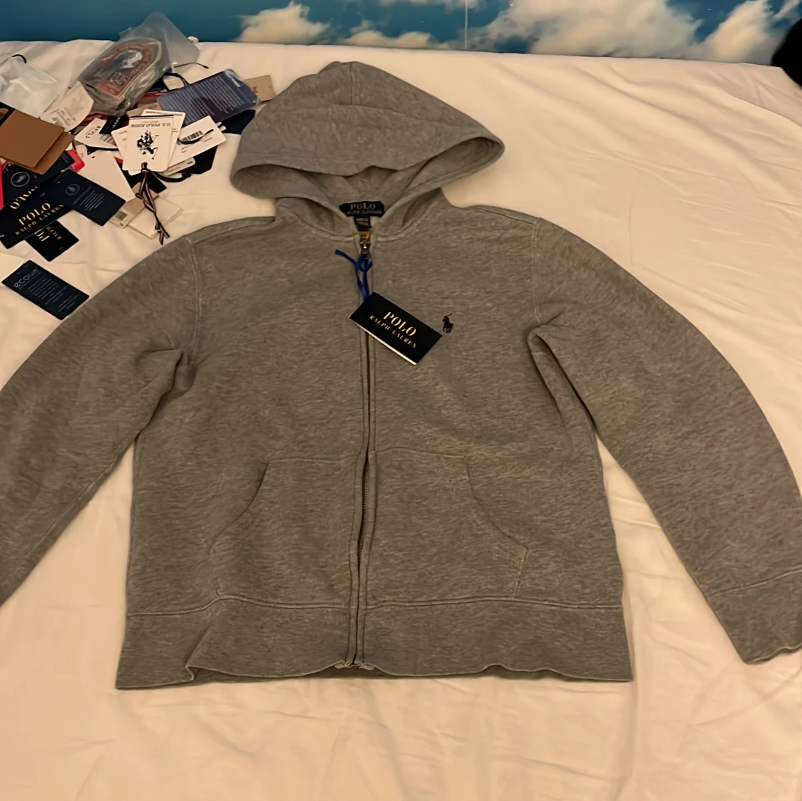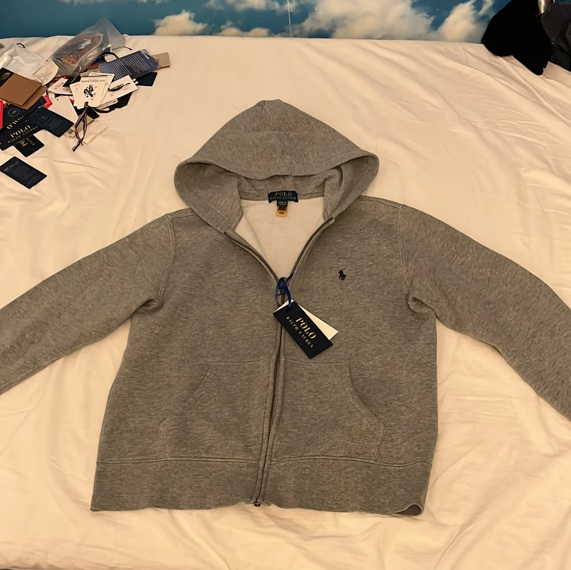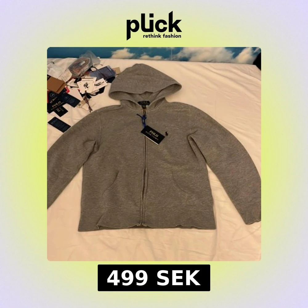 Grå hoodie från Polo Ralph Lauren med dragkedja framtill och klassisk huva. Tröjan har broderad logga på bröstet och är tillverkad i mjuk bomullsblandning. Perfekt för chill dagar och enkel att matcha med jeans eller joggers. Kan gå ner i pris.