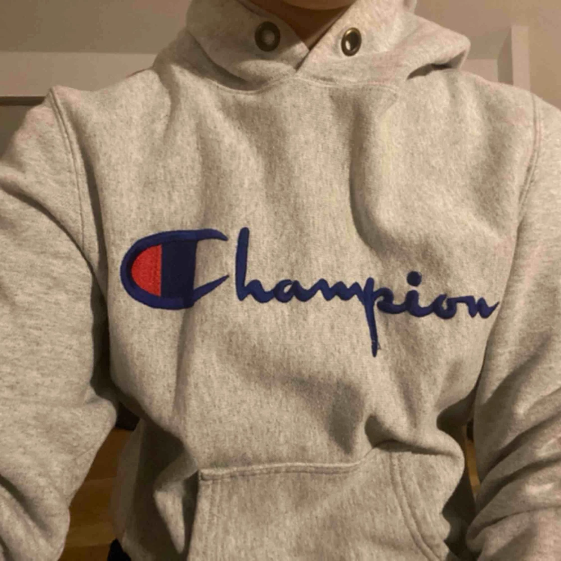 Ljusgrå Championhoodie, den ser mörkare ut på fotot pga ljuset. Tydligt använd men köpte den för 1100 kronor! Storlek S men ganska liten i storleken och av väldigt tjockt material.