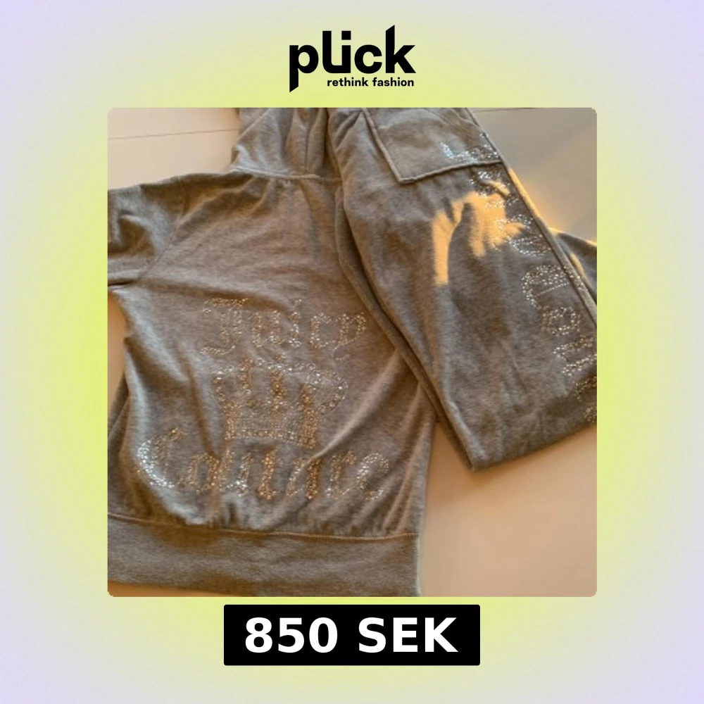 Säljer en snygg gråt set från Juicy Couture med glittrande stenar som bildar logotypen på ryggen och på byxorna. Hoodien har en dragkedja framtill och en bekväm passform. Perfekt för en avslappnad stil med en touch av glamour.En av knapparna saknas dock från ena bakfickan men inget som märks.🩶✨