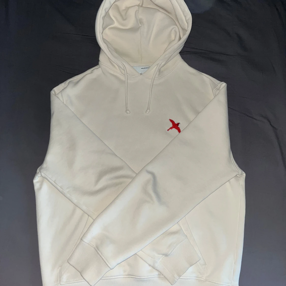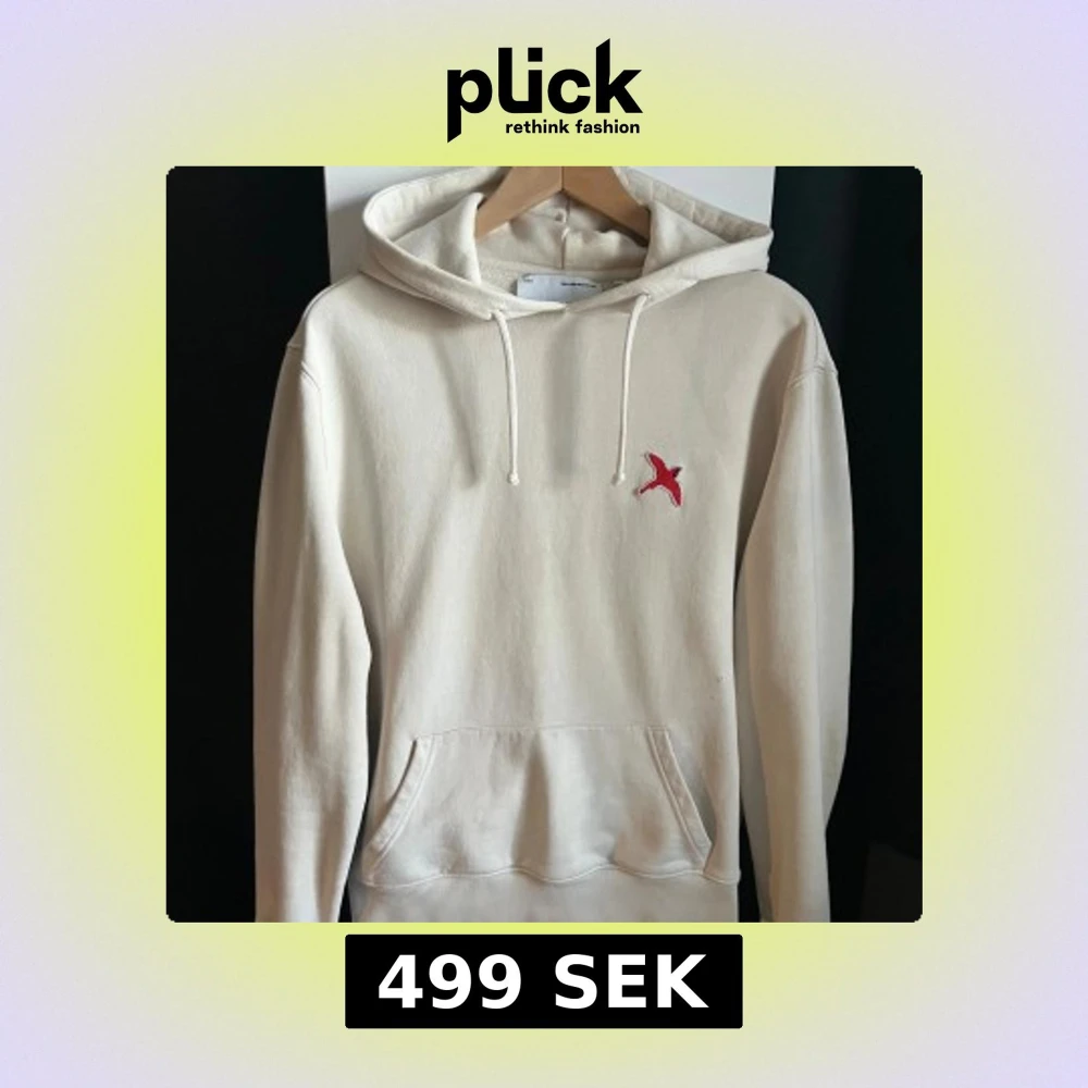 Säljer en stilren beige hoodie från Axel Arigato med broderad röd fågel på bröstet. Tröjan har huva med snörning och en stor magficka. Perfekt för dig som gillar minimalistisk design. Hoodien är i 9/10 skick, endast liten defekt över fickan. (Se bild 4) Storlek S