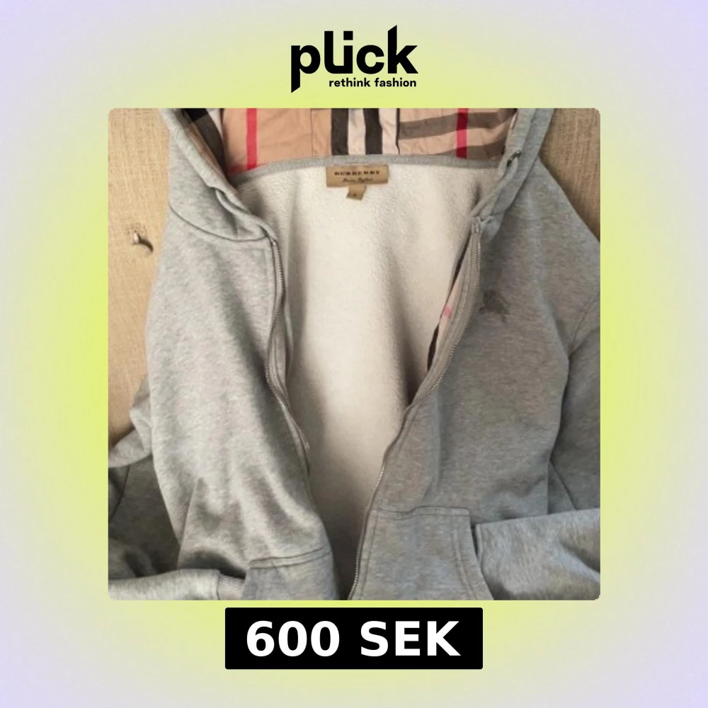Snygg grå zipfrån Burberry med klassiskt rutigt foder i huvan. Jackan har dragkedja framtill, två fickor och är fodrad med mjuk fleece. Perfekt för dig som vill ha en stilren och bekväm jacka med exklusiv känsla.dragkedjan är trasig så den går inte att stänga.
