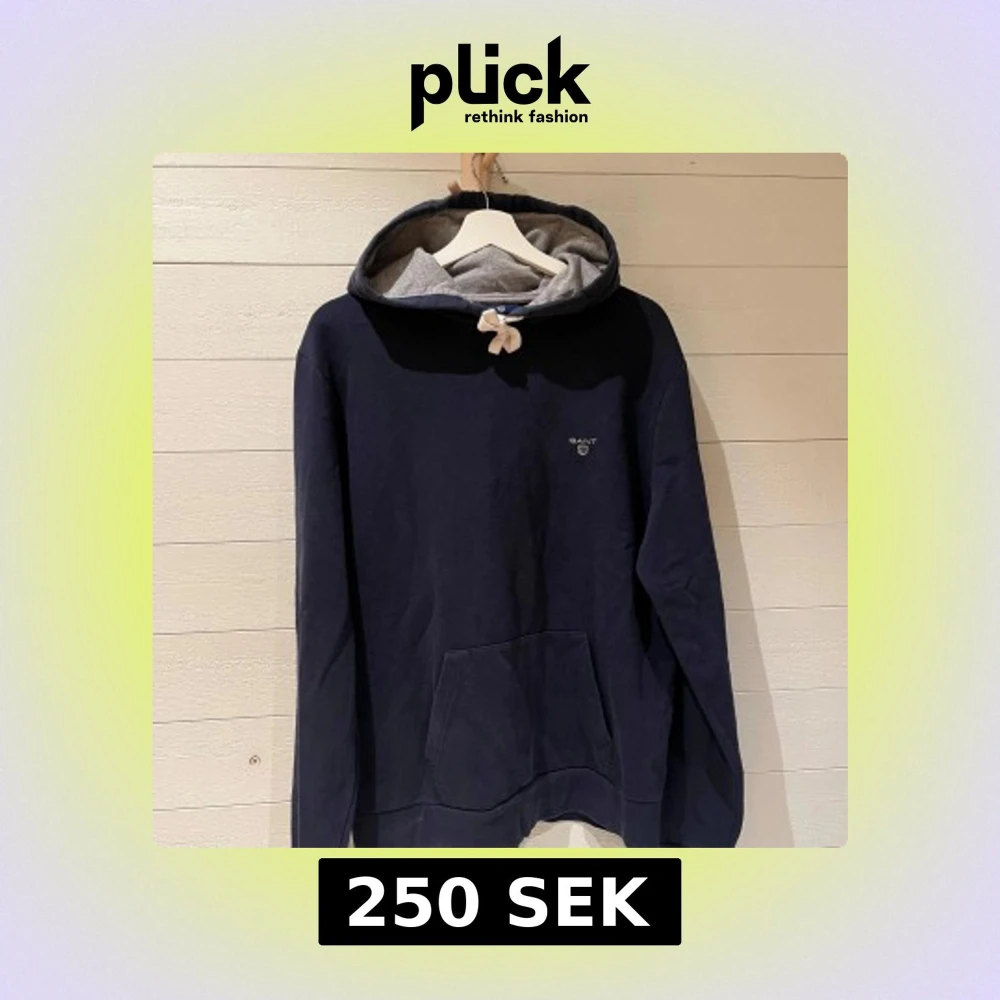Säljer en stilren mörkblå hoodie från Gant med grå insida i huvan och en praktisk magficka. Perfekt för en avslappnad look. Huvan har snörning för justerbar passform. Skick 8/10. Storlek L.