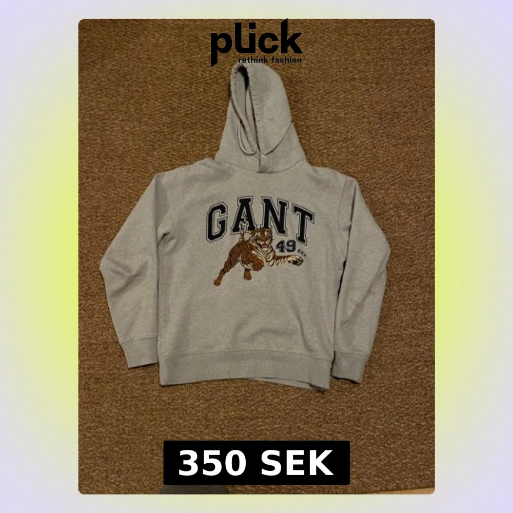 Snygg grå hoodie från GANT med stort broderi på bröstet, där en tiger och texten 'GANT 49 EST.' syns. Tröjan har huva, långa ärmar och ribbade muddar. Perfekt för dig som gillar sportig och cool stil.