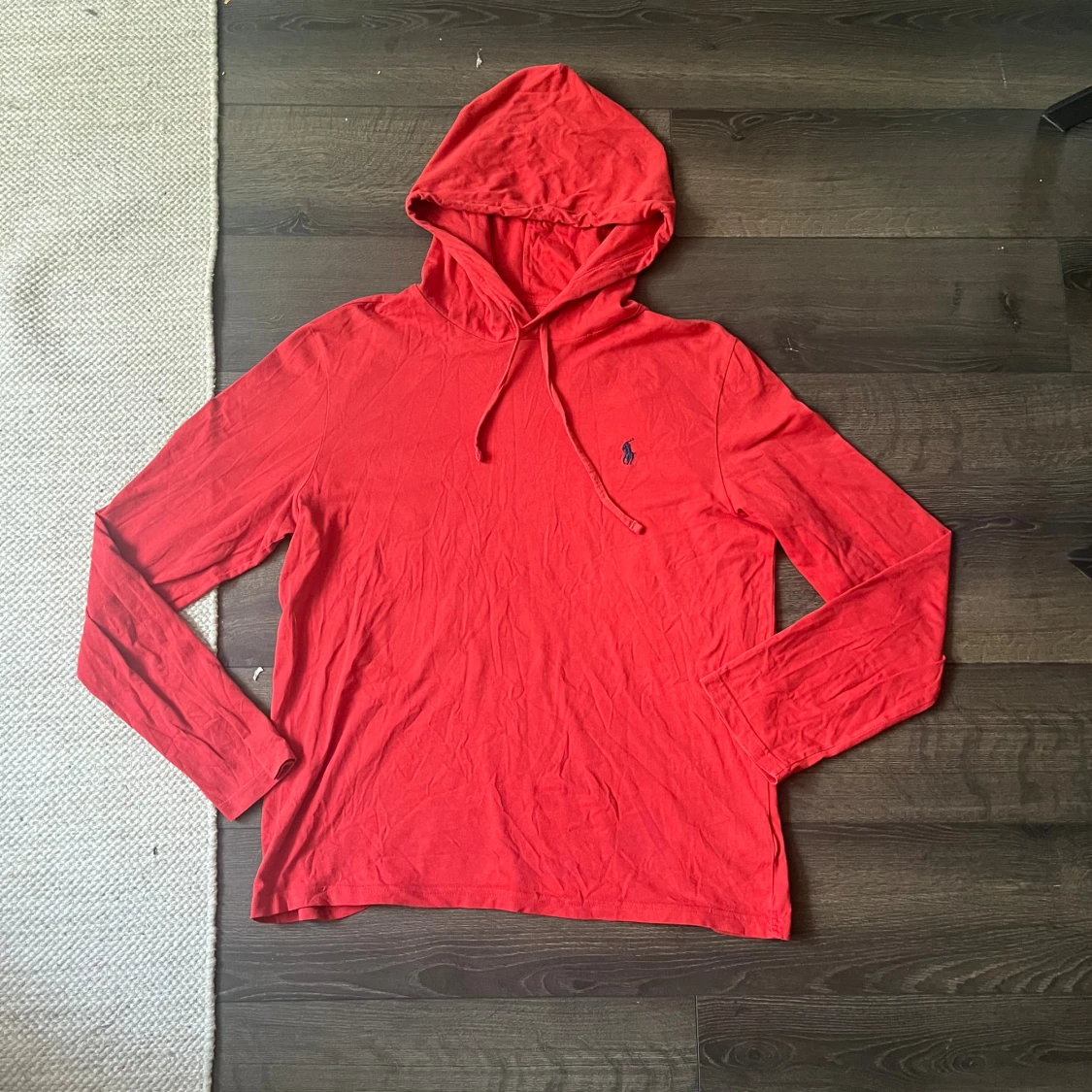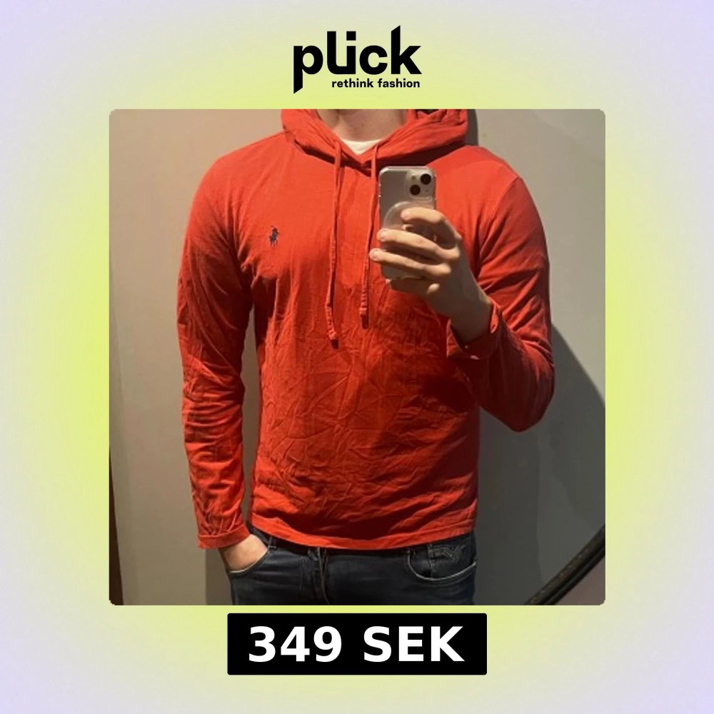 Röd hoodie från Ralph Lauren med klassisk blå logga broderad på bröstet. Tröjan har huva med snörning och är tillverkad i mjuk bomull. Långärmad och med en avslappnad passform, perfekt för en chill look. Endast en minimal defekter som syns på sista bilden :)