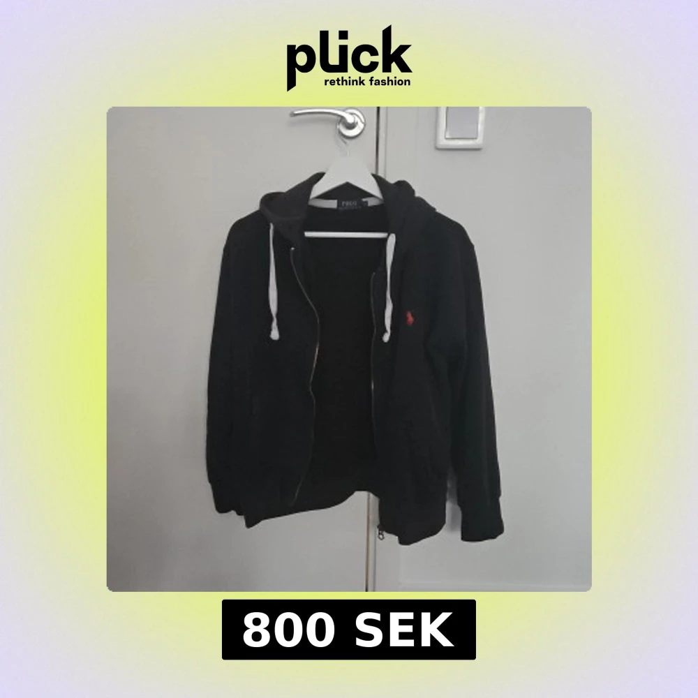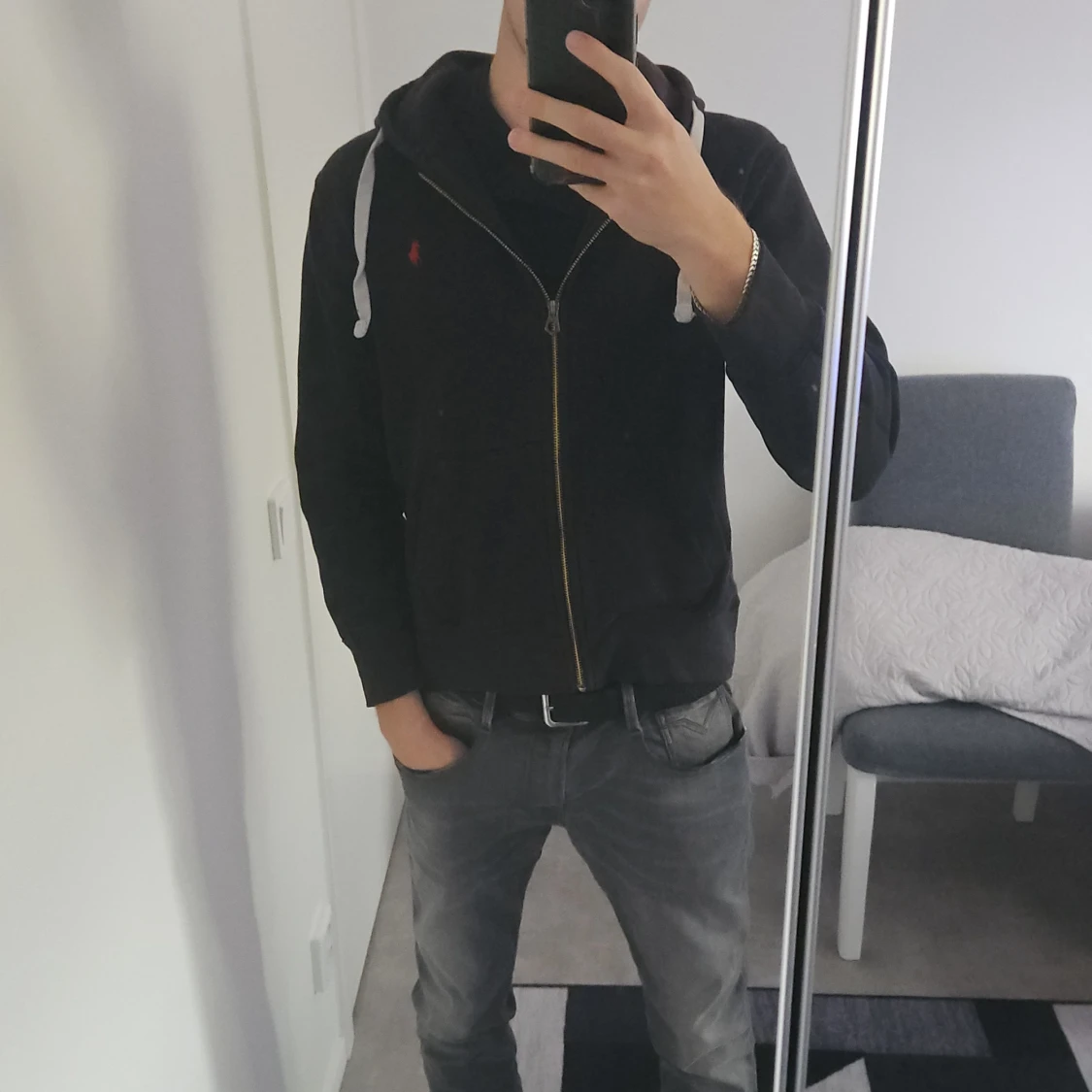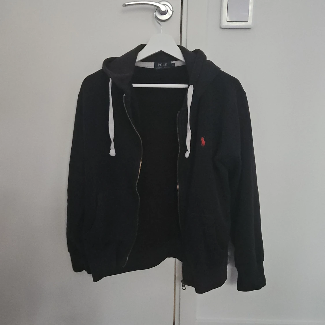 Svart hoodie från Polo Ralph Lauren med vit snörning och dragkedja framtill. Klassisk röd logga på bröstet och huva. Mjuk bomullskänsla och två fickor fram. Perfekt för chill dagar och streetwear-stil. Pris kan diskuteras!