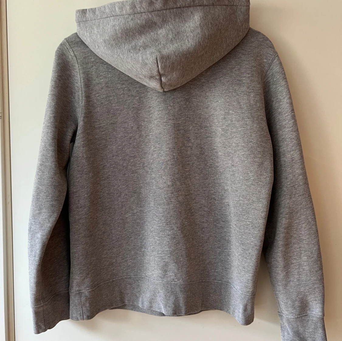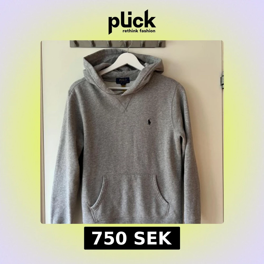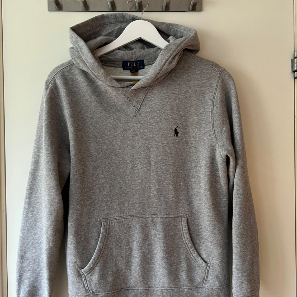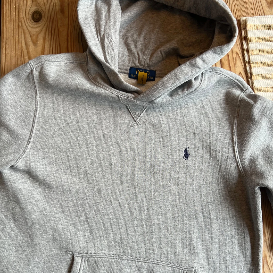 Klassisk grå hoodie från Polo Ralph Lauren med broderad marinblå logga på bröstet. Tröjan har huva, känguruficka och långa ärmar. Mjuk och skön bomullsblandning, perfekt för chill dagar eller när du vill ha en clean look. Storleken är (14-16) år. Från axel till midja är det 59 cm, 46 cm bred och ärmen 58 cm. Om du har några frågor är det bara att skriva