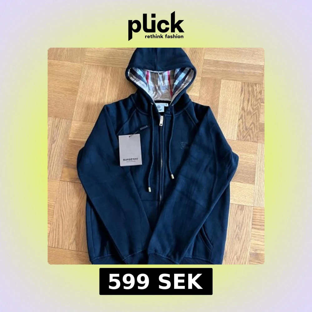Svart/mörkblå hoodie från Burberry med klassisk logga broderad på bröstet och ikoniskt rutigt foder i huvan. Tröjan har dragkedja framtill, snörning i huvan och ribbade muddar. Tillverkad i mjuk bomull för en skön känsla. Storlek M men passar bättre i S enligt mig