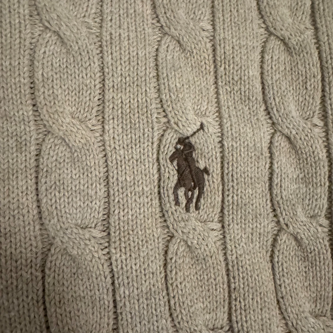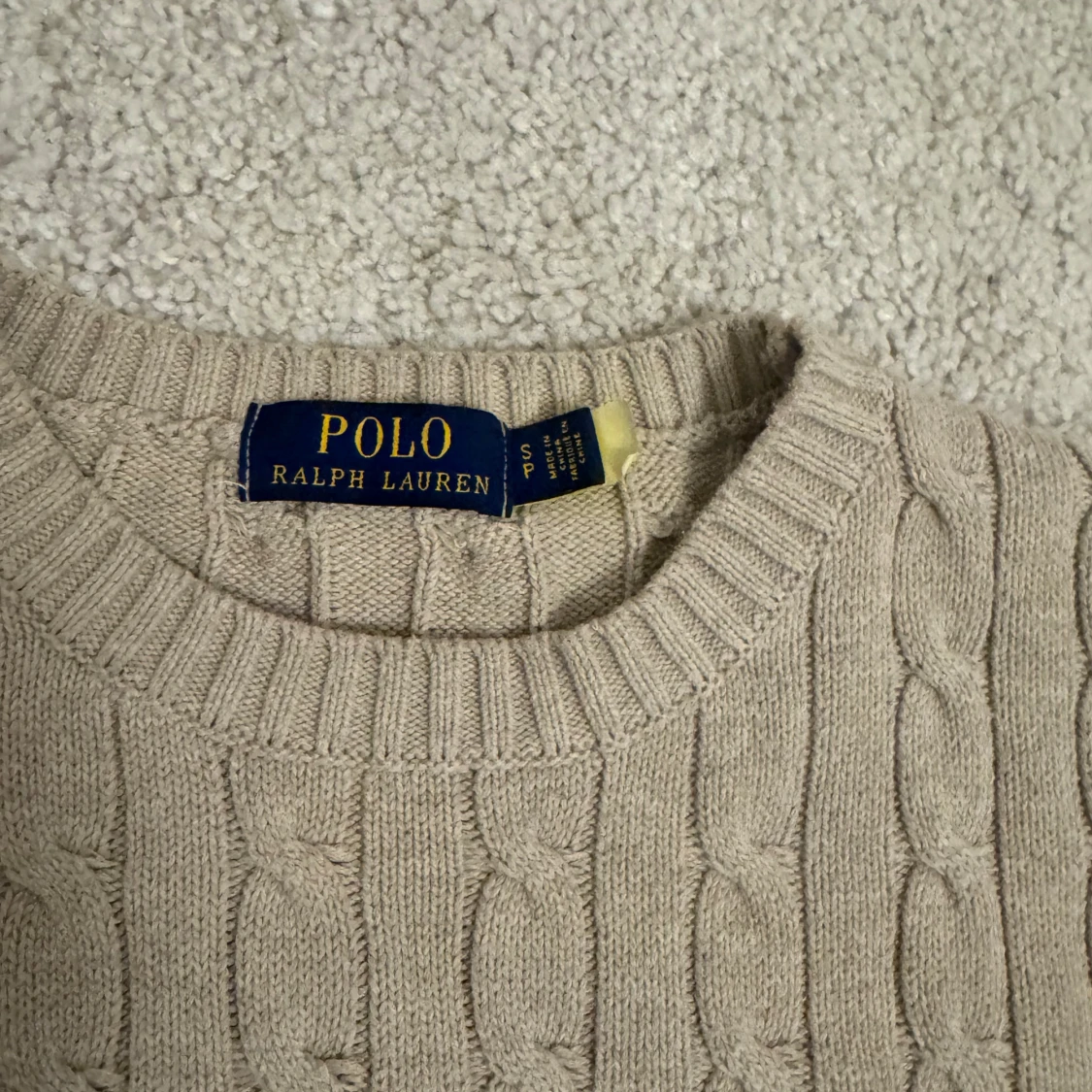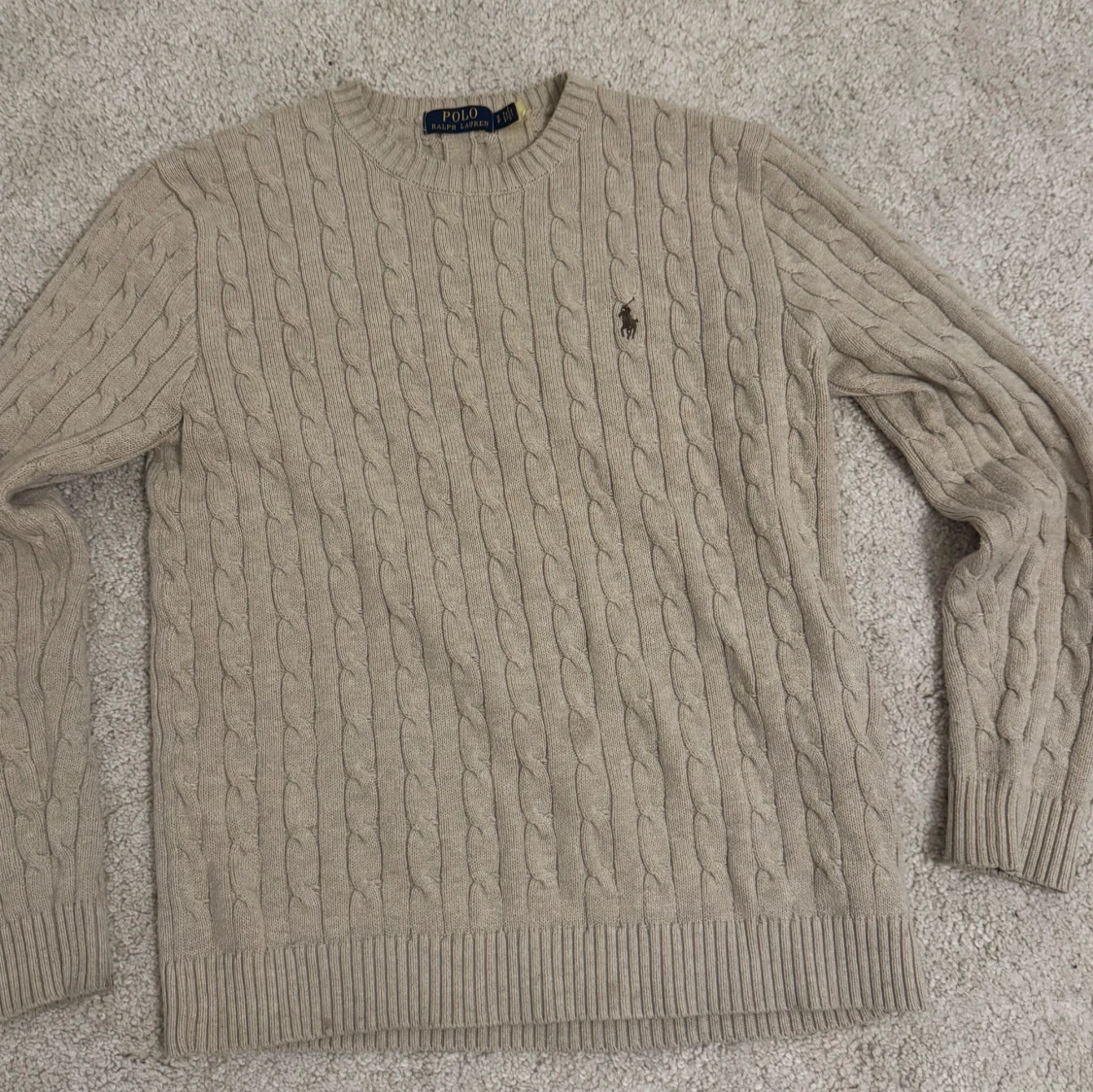 Säljer en stilren beige stickad tröja från Ralph Lauren med kabelstickat mönster och broderad logotyp på bröstet. Tröjan har långa ärmar och rund halsringning. Den är varm och ger dig en old money look samt Perfekt för kyligare dagar! Inga defekter. Storlek S men passar både s-m, riktigt stretchigt material som gör att den passar på nästan alla