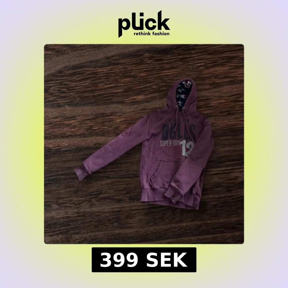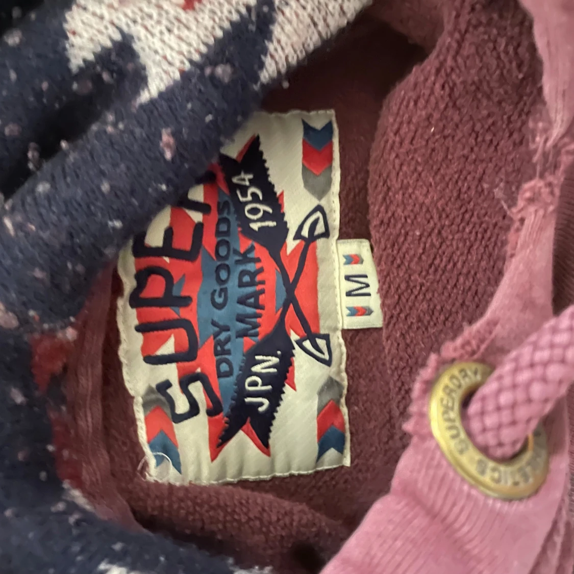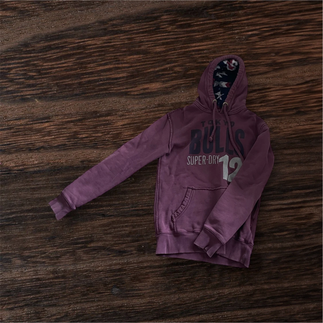 Säljer en mörkröd hoodie från Superdry med stort tryck på bröstet och känguruficka. Och även snygg fodring vid luvan