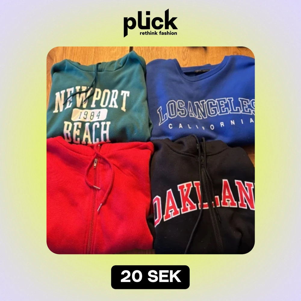 1 tjocktröja, 1 hoddie, två zip tröjor från SHEIN, 20kr styck eller alla för 75kr, röd st L, svart st S, blå st S, grön st S