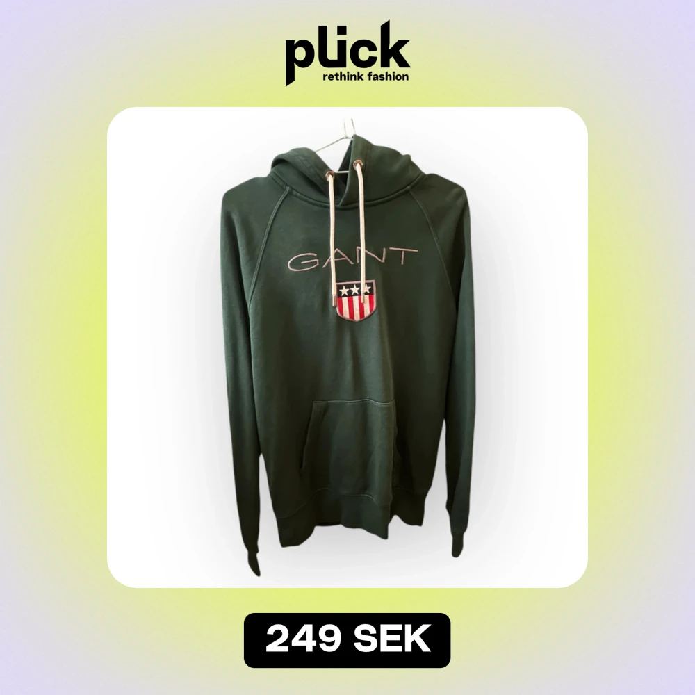 Säljer en snygg grön hoodie från GANT i storlek M. Den har en klassisk design med GANT-loggan och ett coolt emblem på framsidan. Perfekt för höst och vår med sin mjuka och bekväma passform. Huvan har vita snören och en känguruficka framtill. Passar både till vardags och chill.
