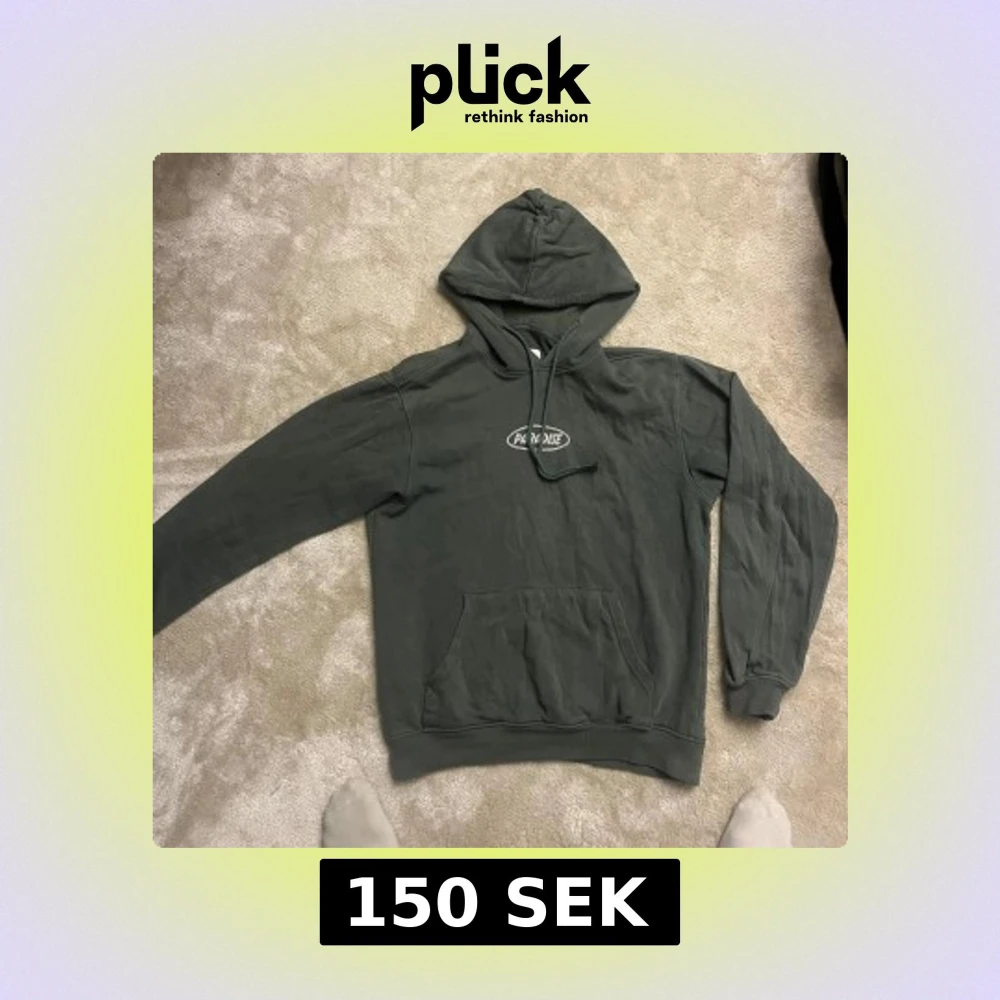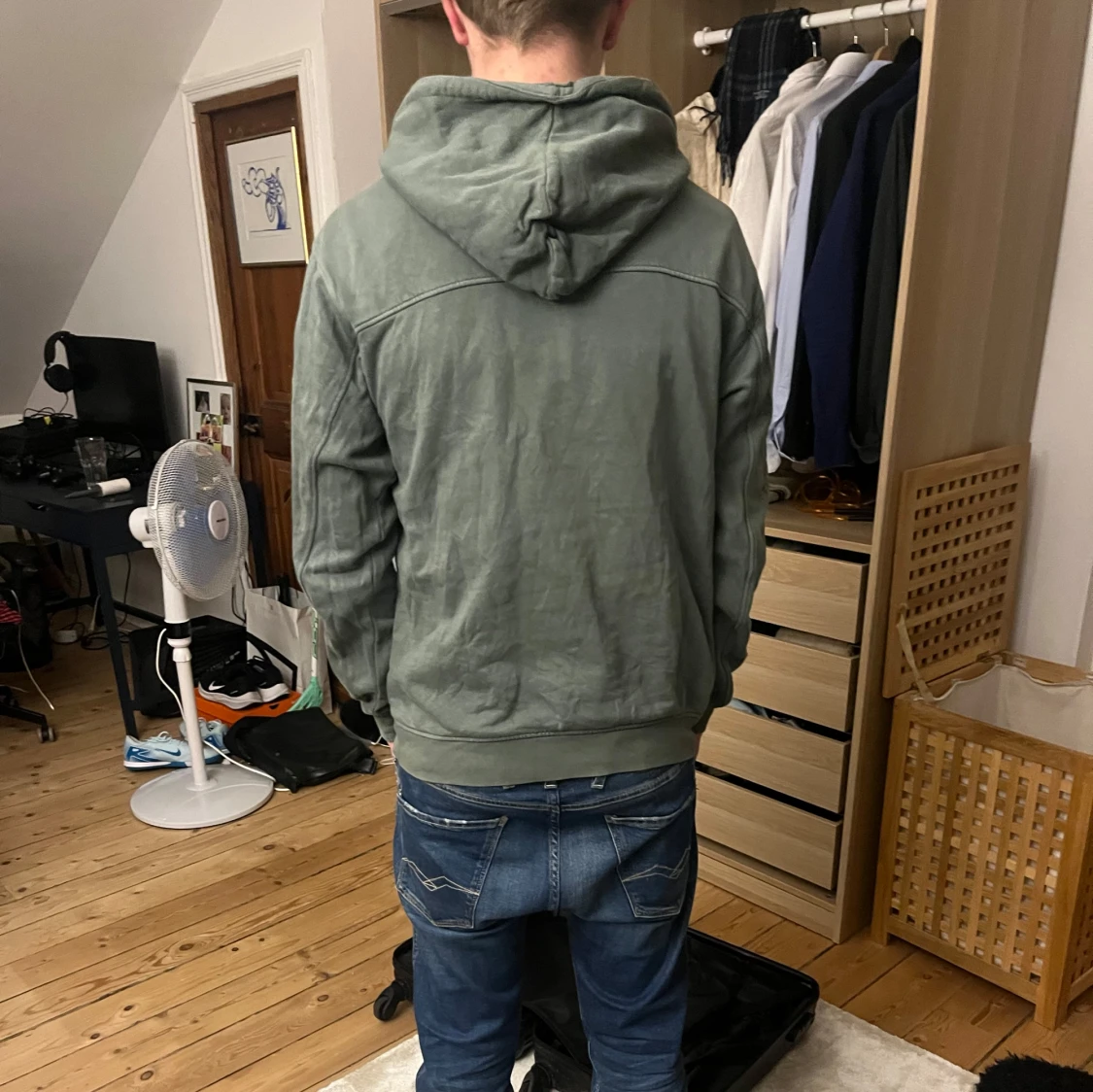 Säljer en grön vintage stil hoodie med tryck på bröstet. Slim fit. Den har en klassisk känguruficka och justerbar huva med snören. Perfekt för en avslappnad stil. Köpt på carlings.