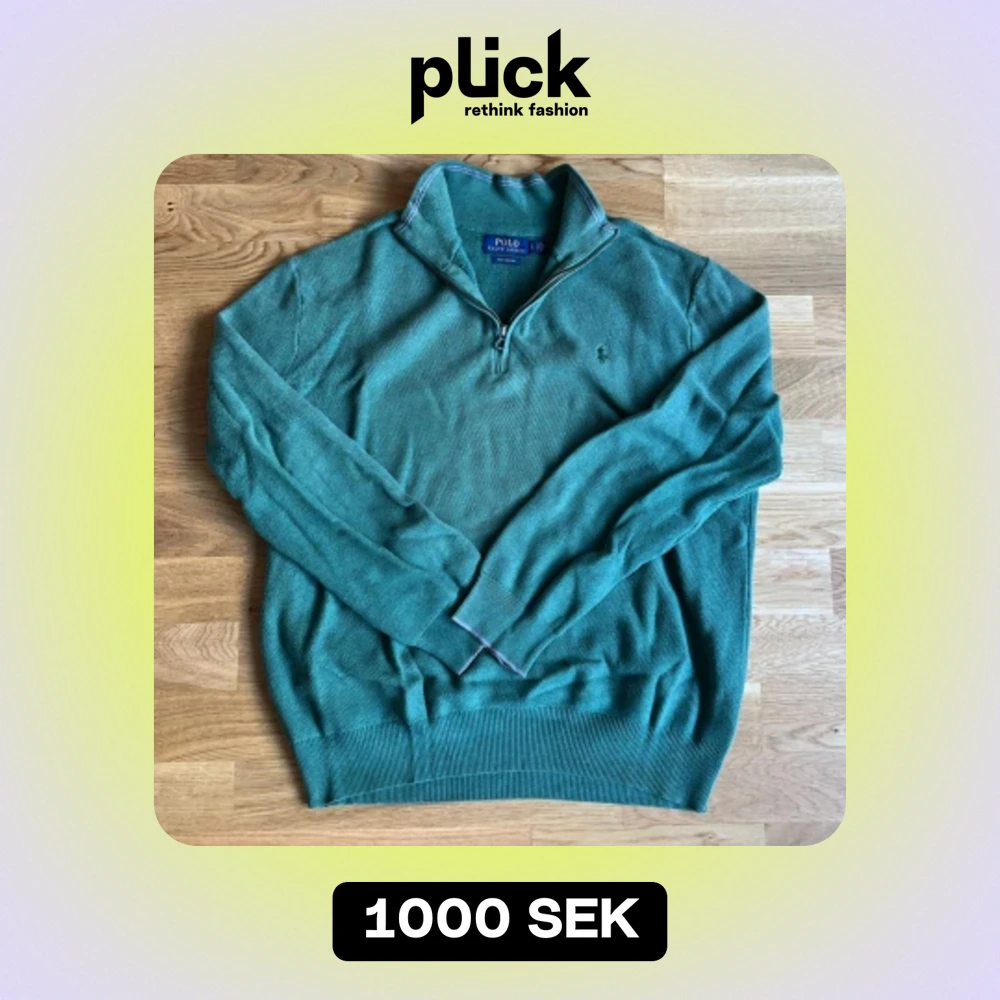 En grön halfzip tröja perfekt för hösten och vintern. Har små gråa detaljer i slutet av ärmarna och inne i kragen. Ser grönare ut på vissa bilder. Nyansen på bild 3 är mest lik hur färgen ser ut i verkligheten. En storlek L men passar även M.