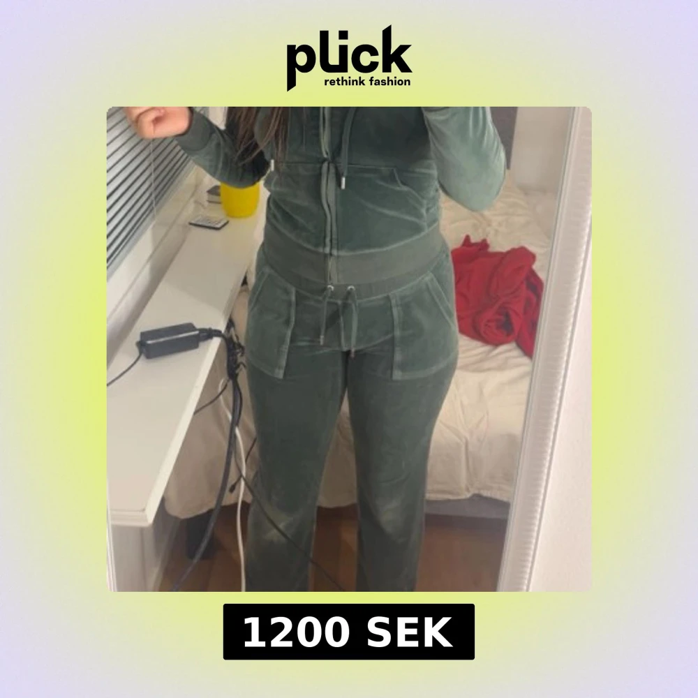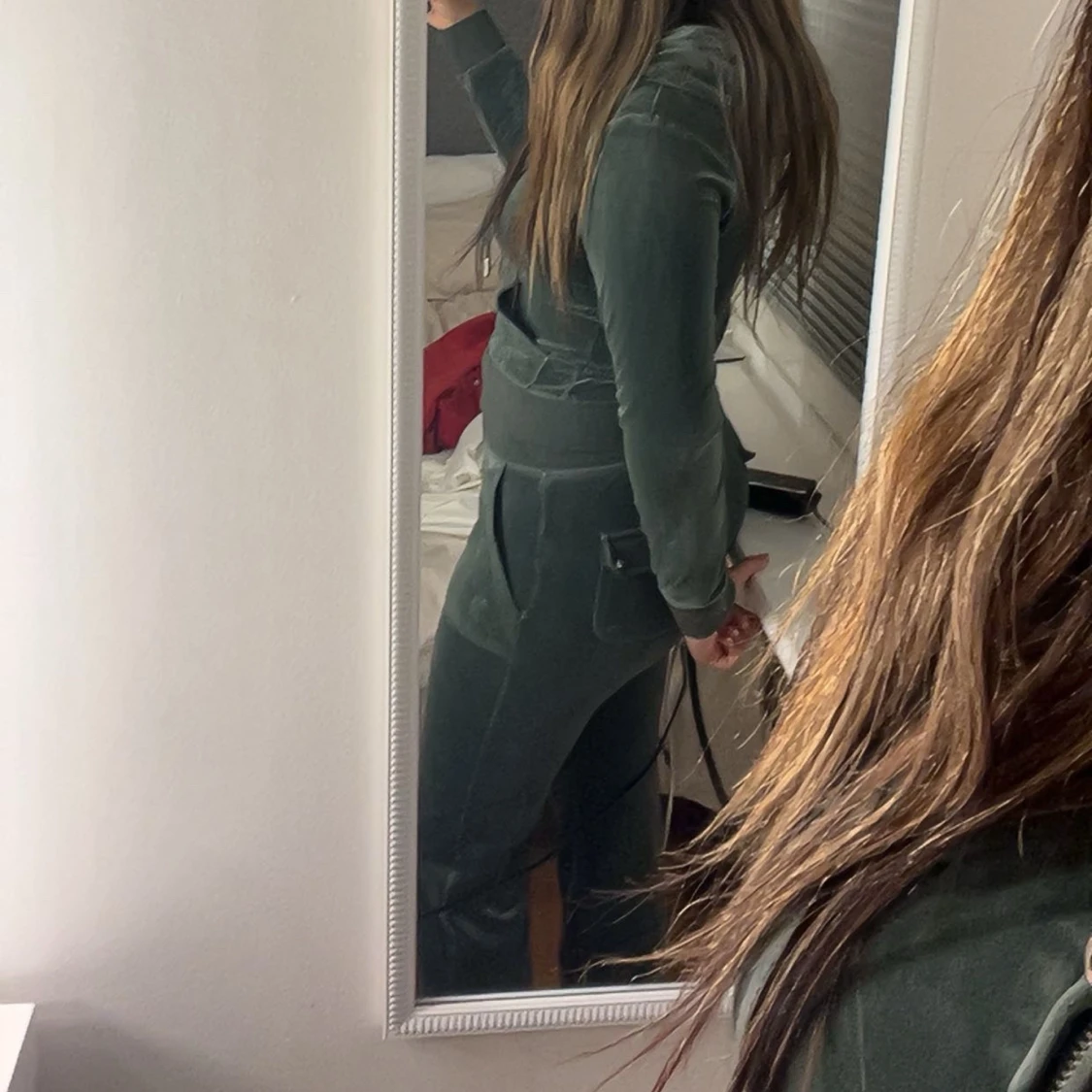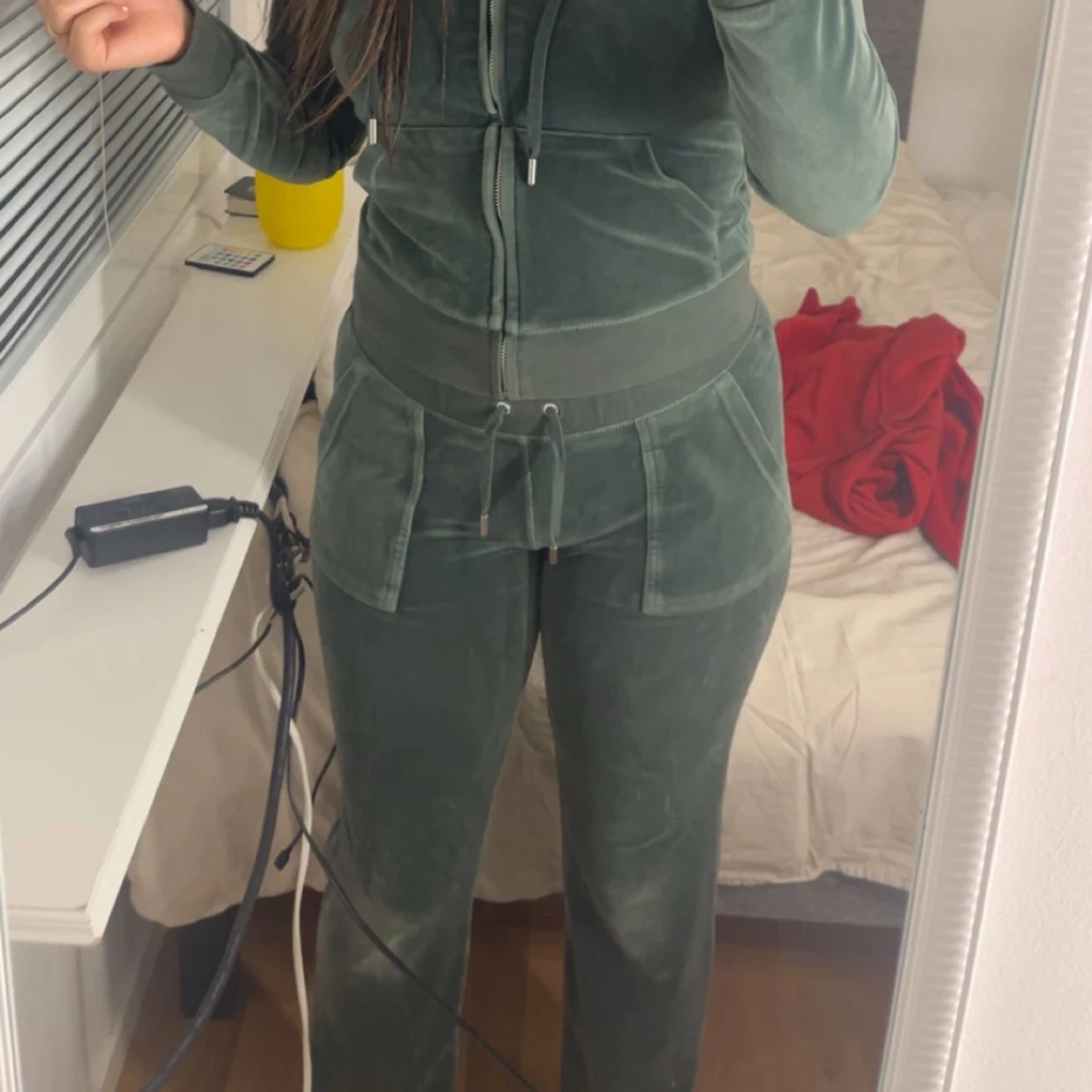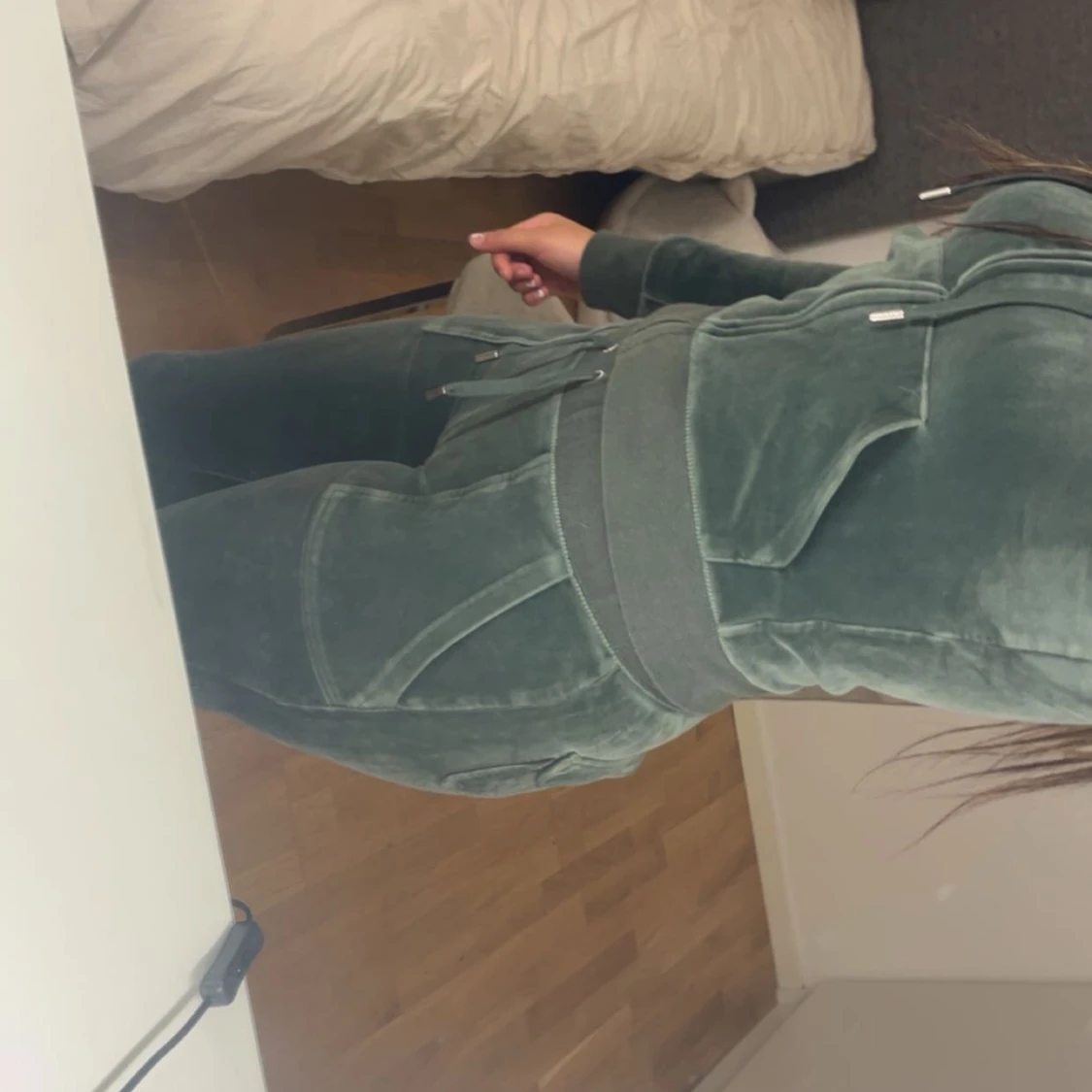Mörkgröna mjukisbyxor i mjuk sammet med bred resår i midjan och snörning framtill. Byxorna har raka ben och stora fickor både fram och bak. Perfekta för en chill och avslappnad stil.