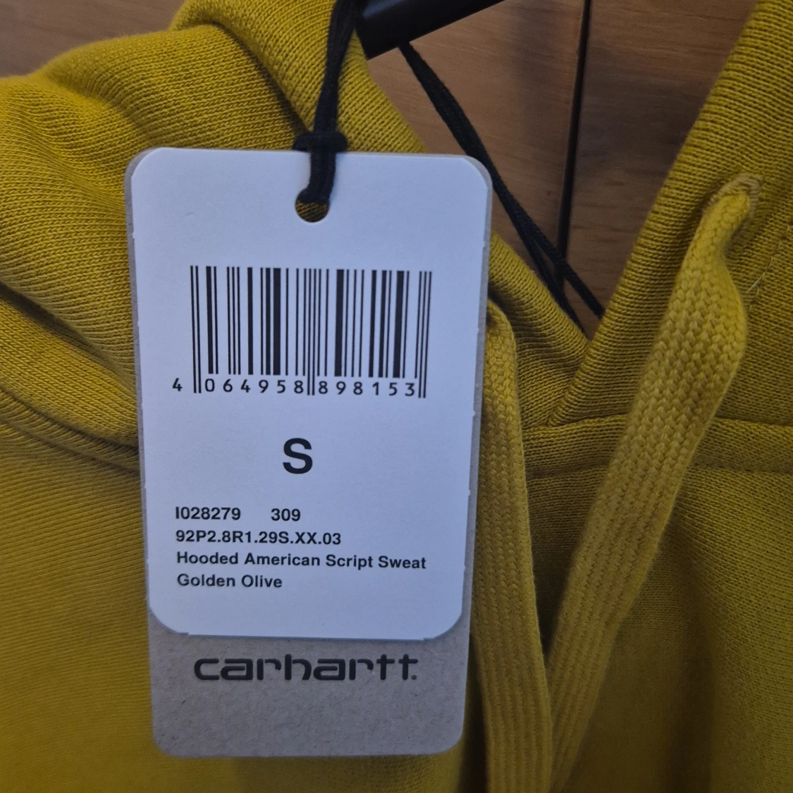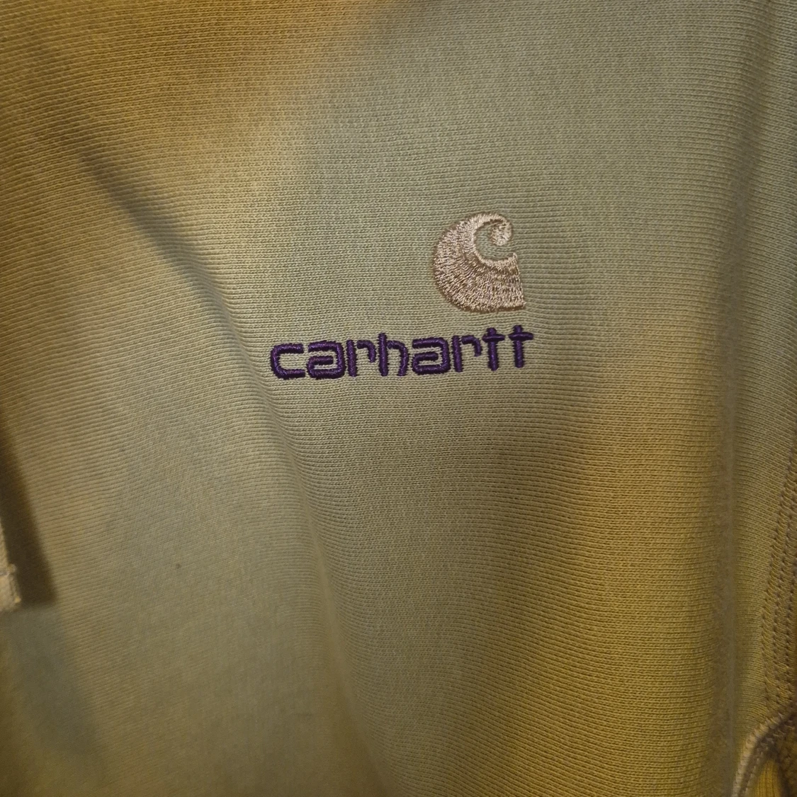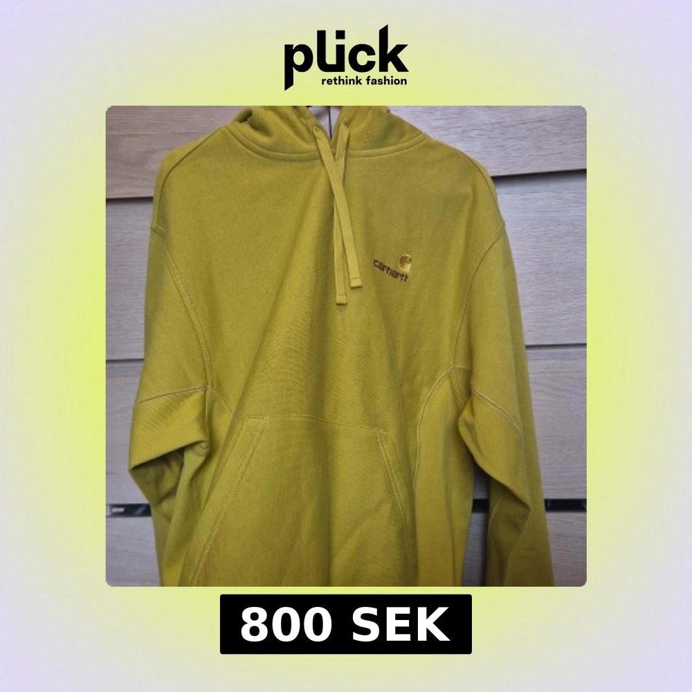 Säljer en snygg hoodie från Carhartt i färgen golden olive. Tröjan har broderad logga på bröstet, huva med snörning och stor känguruficka framtill. Perfekt för dig som gillar streetwear och vill sticka ut med en cool gul färg.