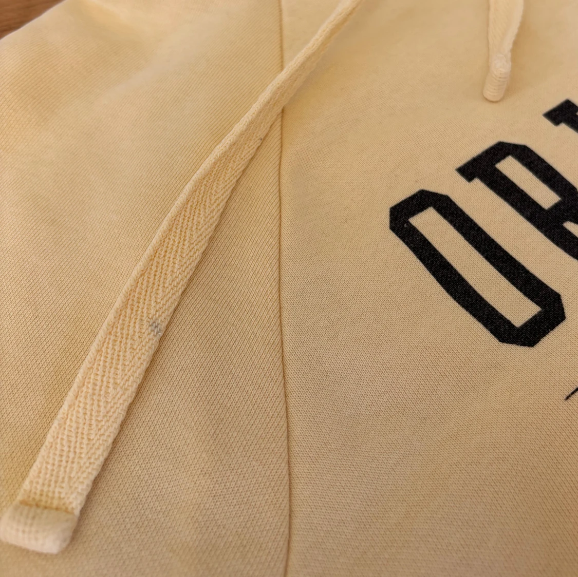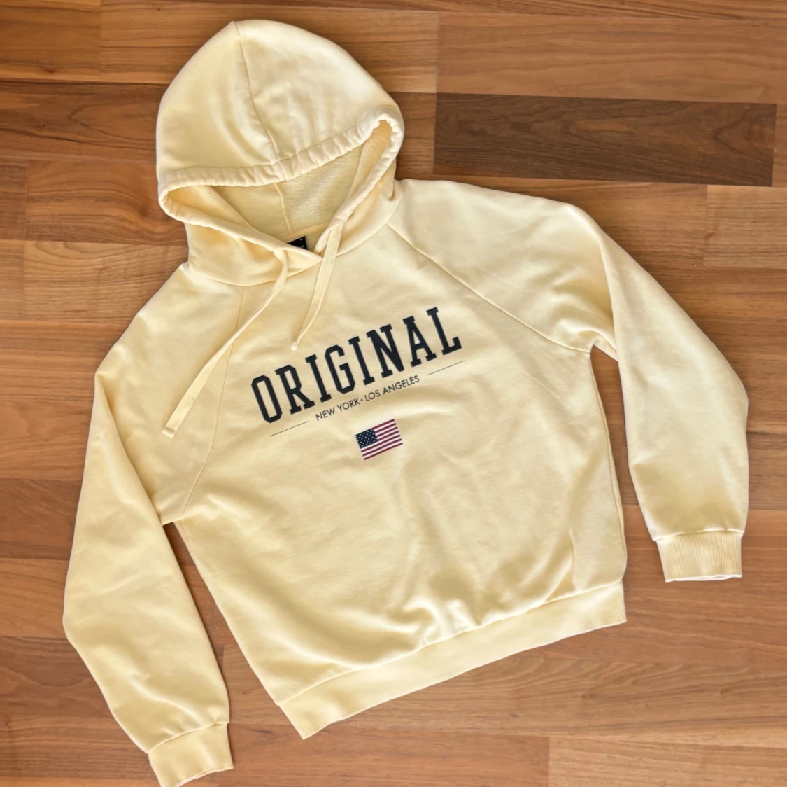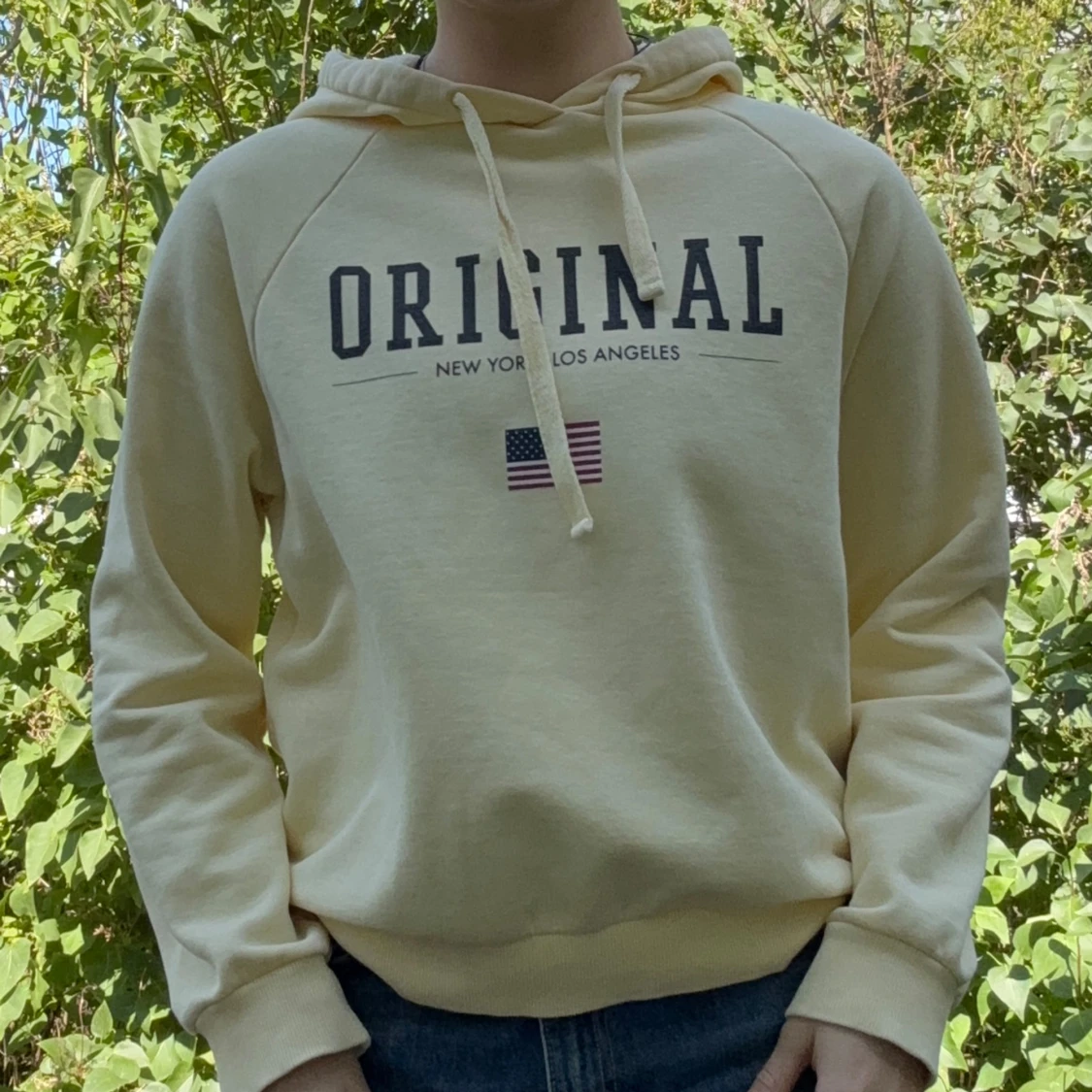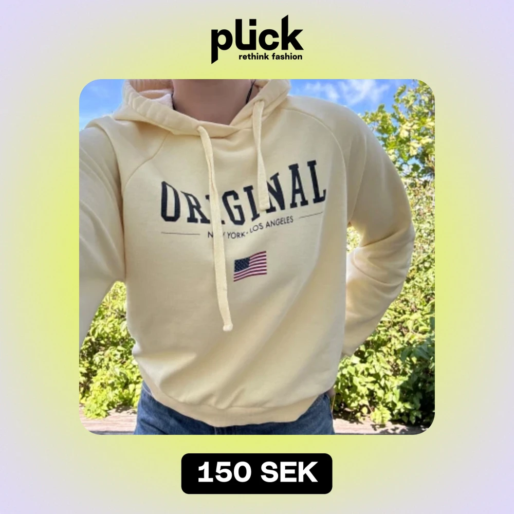 Gul, stilren hoodie med tryck från Gina Tricot. Storlek: M. Material: 69% bomull + 31% polyester. Finns en näst intill osynlig fläck på ena snöret (visas på sista bilden). :)