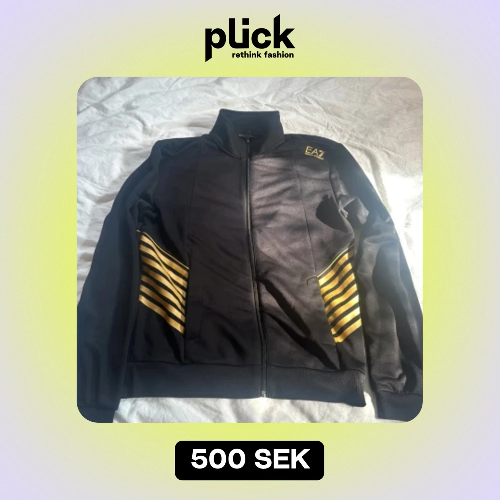 Säljer en snygg svart jacka från Emporio Armani med coola guldfärgade detaljer. Jackan har en dragkedja framtill och EA7-loggan på bröstet. Perfekt för en stilren look!