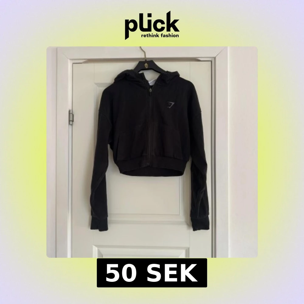 Säljer en svart croppad hoodie från Gymshark. Den har en dragkedja framtill och en praktisk huva. Perfekt för en sportig look eller avslappnade dagar. Långärmad design med ribbade muddar.