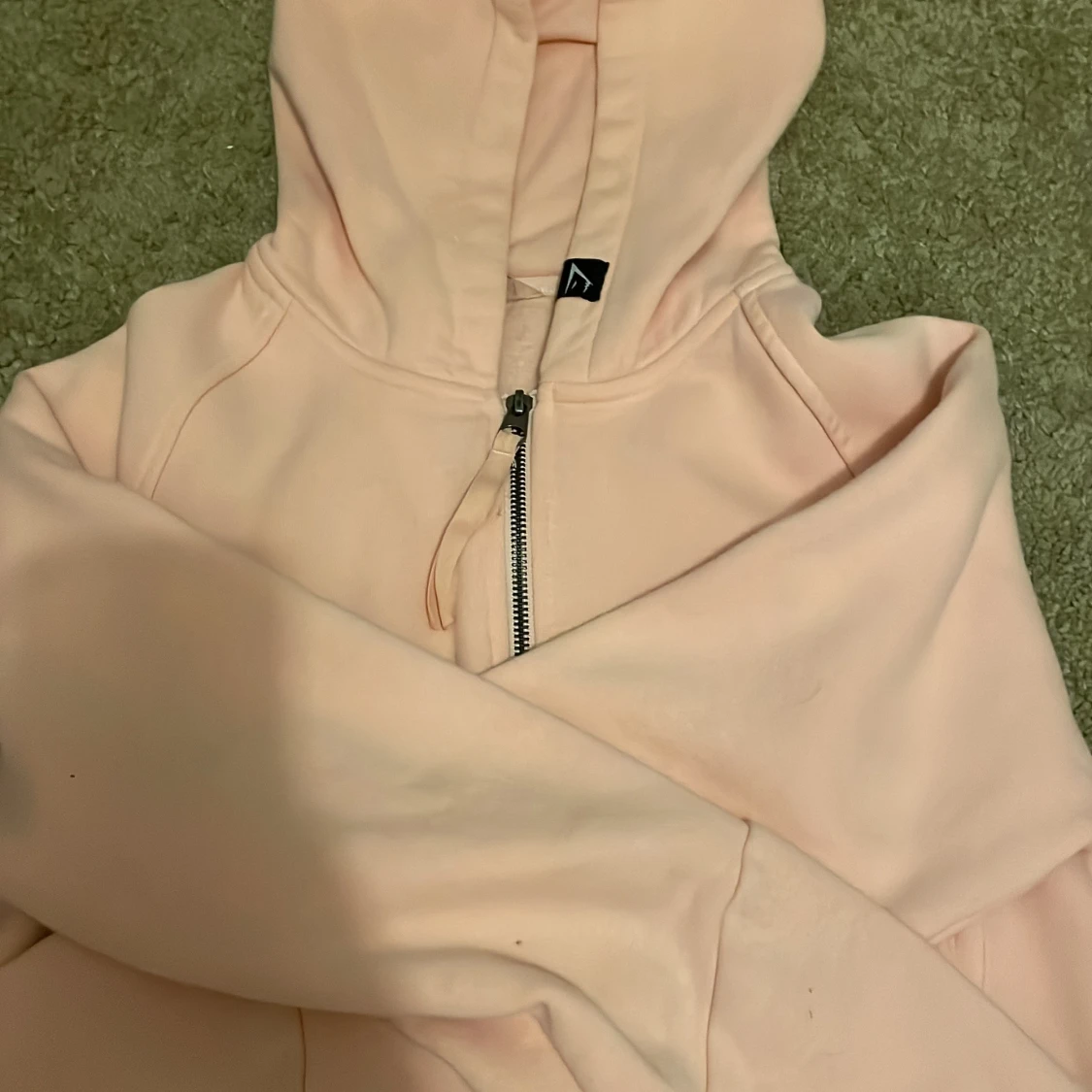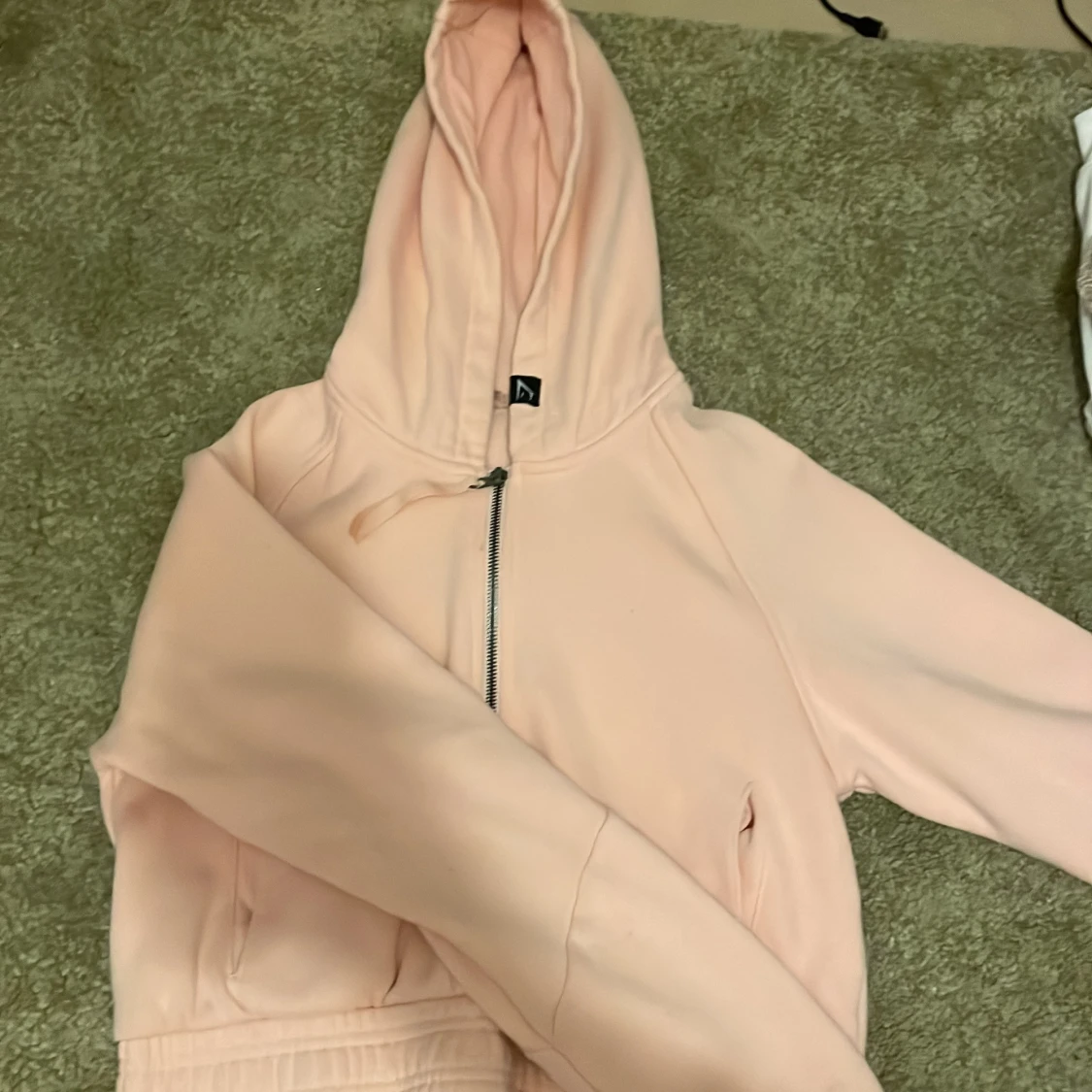 Säljer en ljusrosa hoodie med huva och dragkedja framtill. Tröjan har långa ärmar och en mjuk, skön känsla. Perfekt för en avslappnad stil och enkel att matcha med jeans eller leggings.
