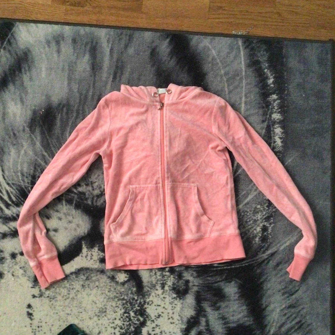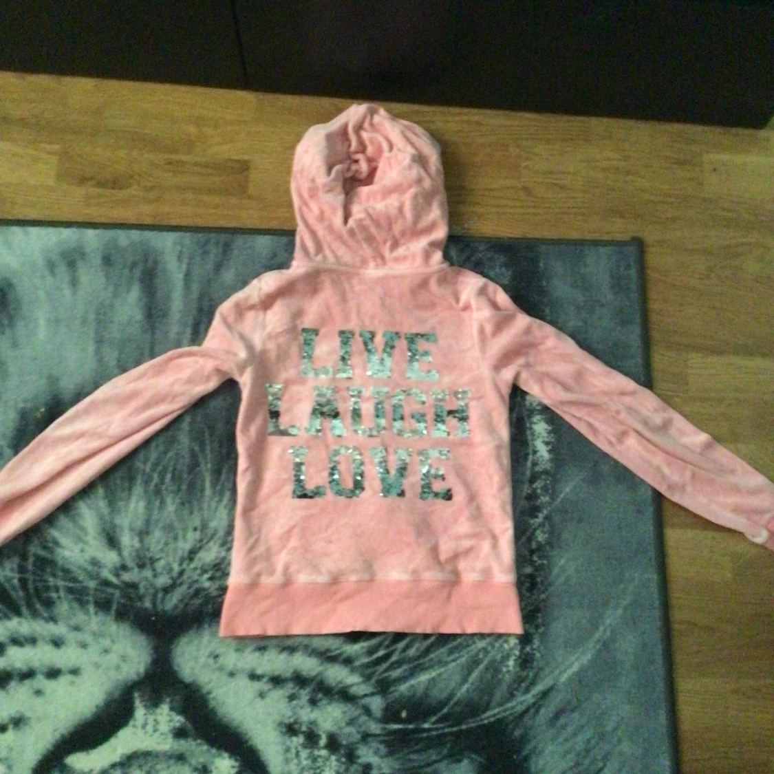 Rosa tröja med text på baksidan. Tyvärr inga snören kvar