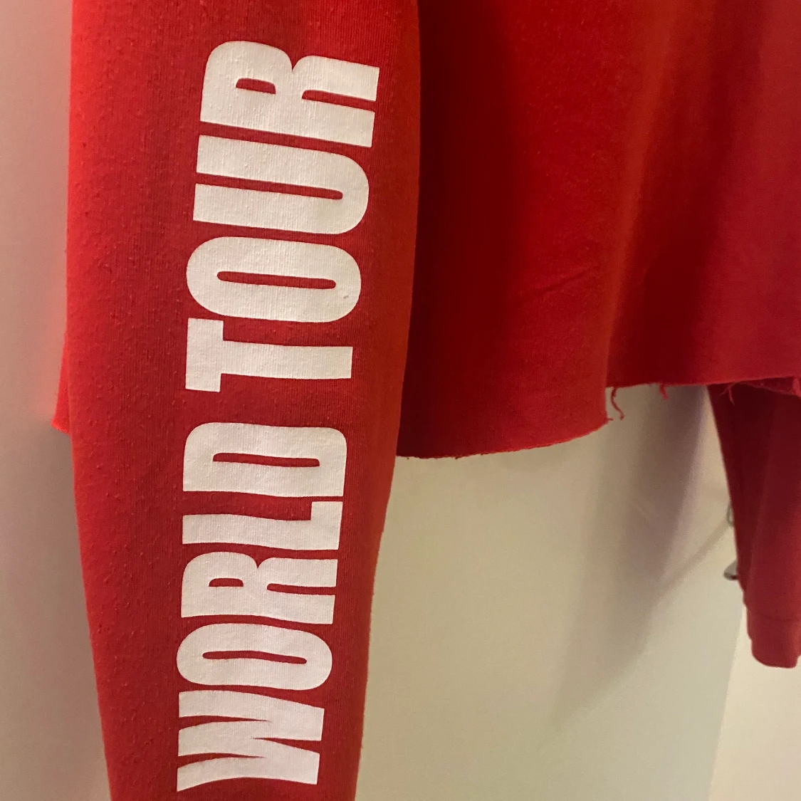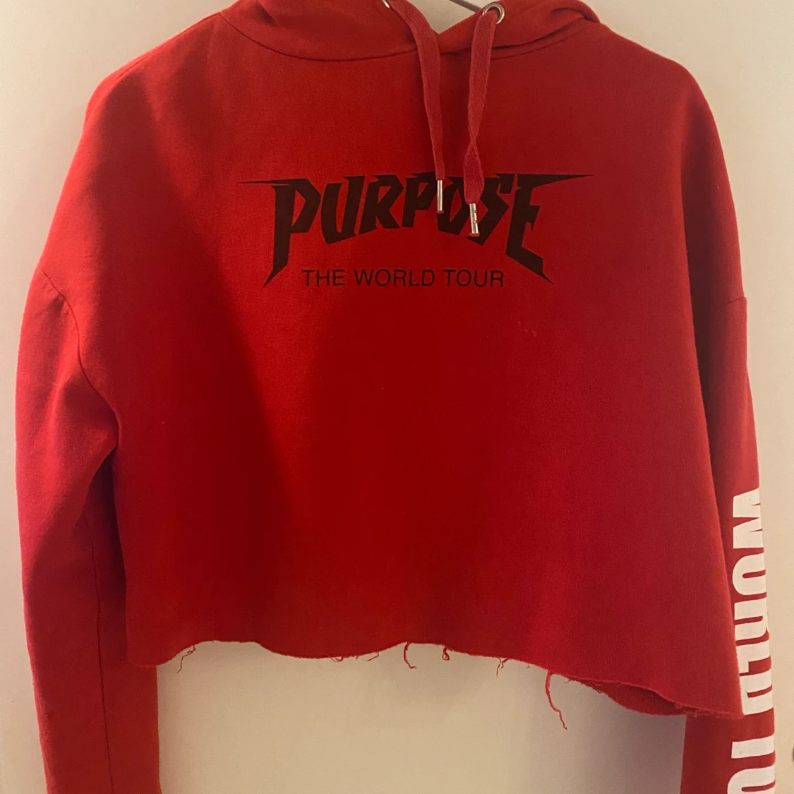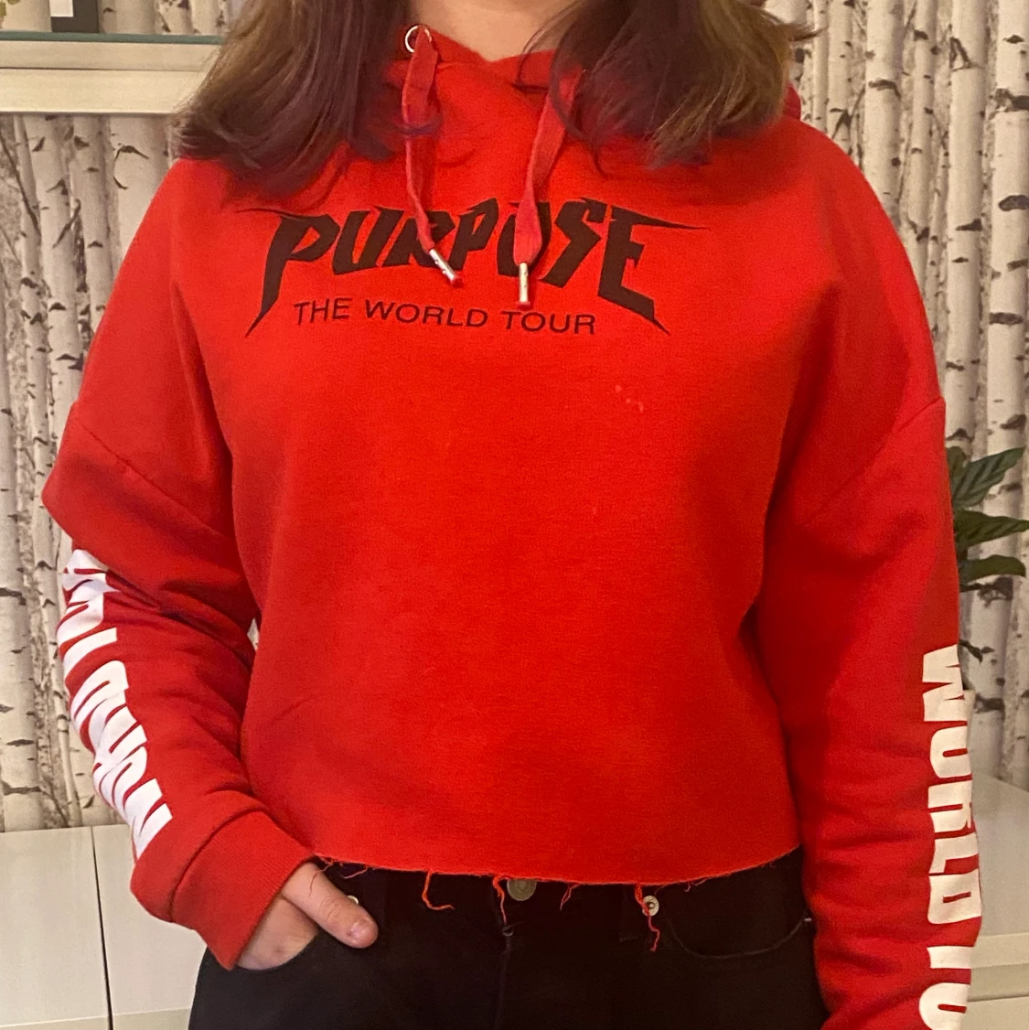 Croppad röd hoodie med purpose tour motiv. Avskuren midja och sparsamt använd