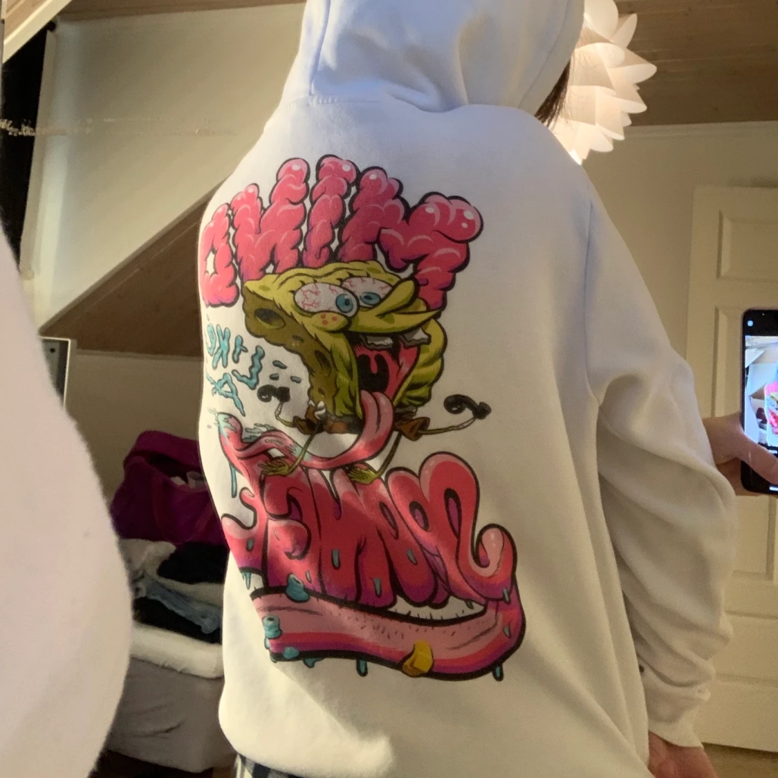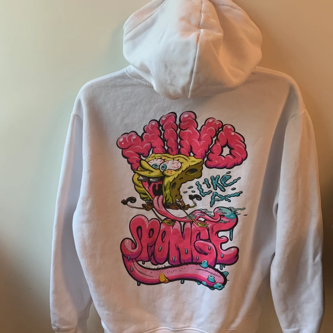 En vit hoodie med ”svampbob” tryck, väldigt skön men inte riktigt min stil. Använda några få gånger men i fint skick. :)))