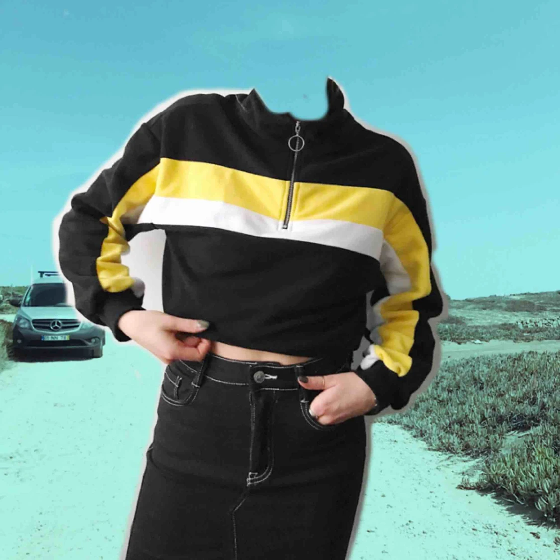 Midjekort tröja med krage i fleecematerial. Använd typ 3 gånger, den är som ny. Dragsko i midjan så att man kan spänna in den om man vill. Fler bilder finns, hojta ba.