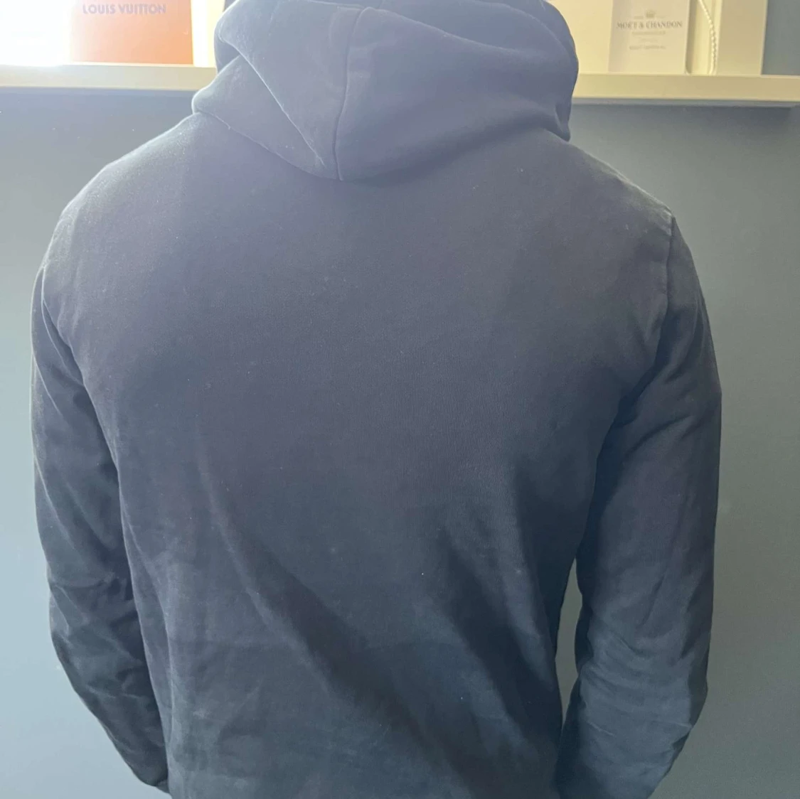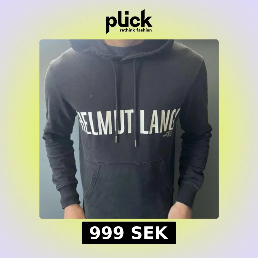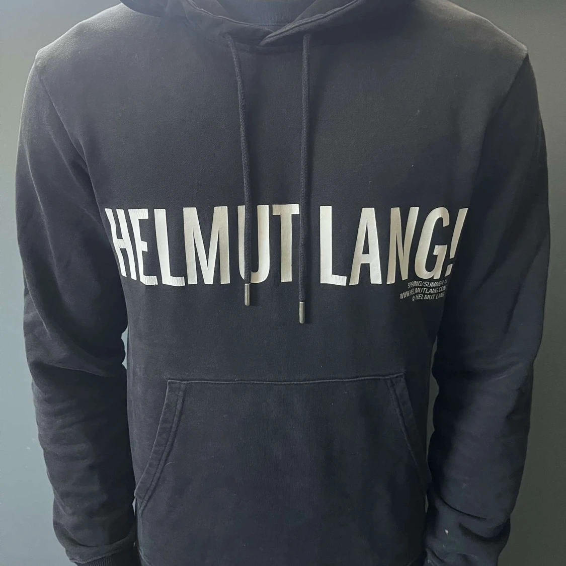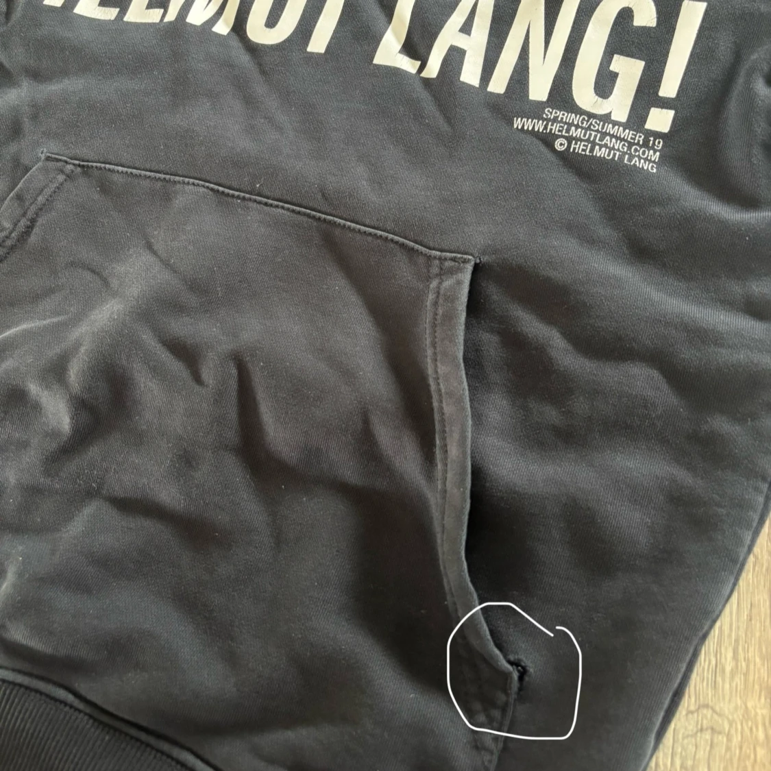 Svart Helmut Lang hoddie med tryck på bröstet. Två små hål som knappast syns på sidorna av magfickan (se bild)