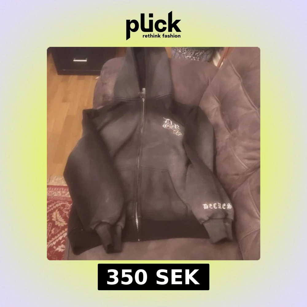 Säljer en svart hoodie från Decrese med broderad text på bröstet och ärmen. Den har en dragkedja framtill och en rymlig huva. Perfekt för en avslappnad stil.