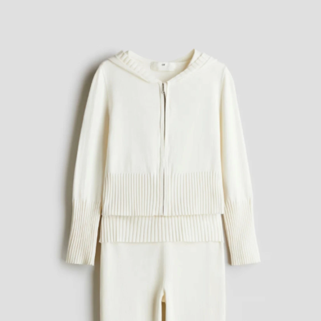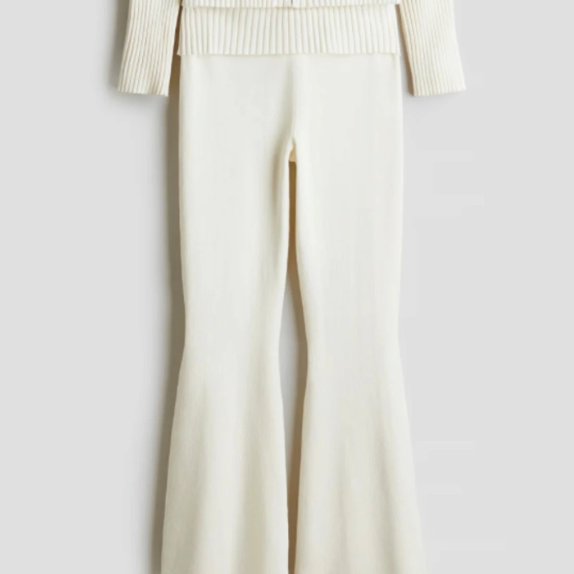 SĂ€ljer ett par vita stickade byxor med bootcut-silhuett. Byxorna Ă€r ribbstickade upptill och har en mjuk, stretchig kĂ€nsla. Perfekta för en chill och trendig look. Skit snyggt för en mysig look!đ