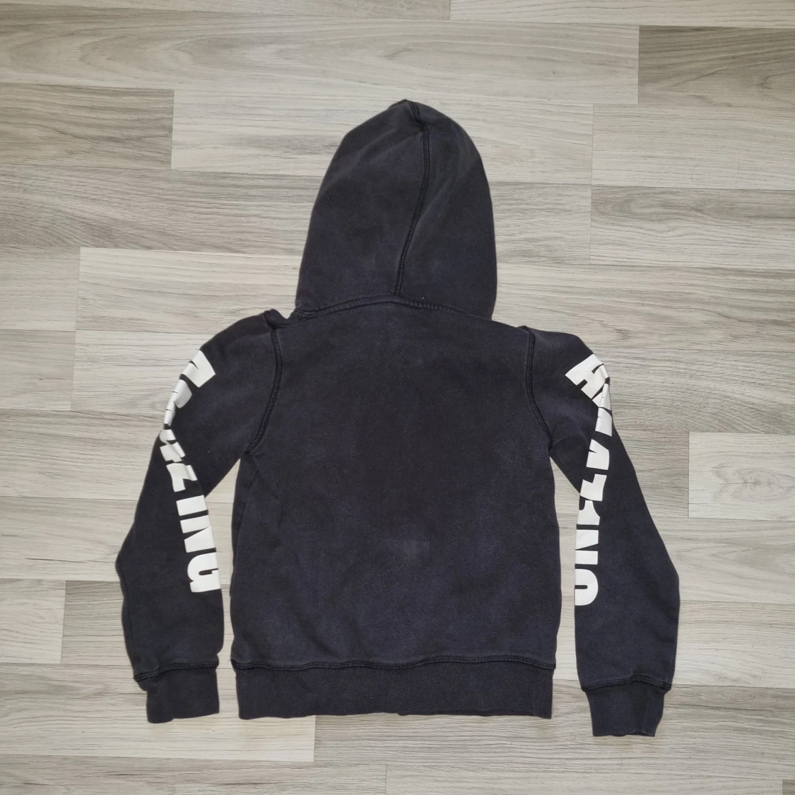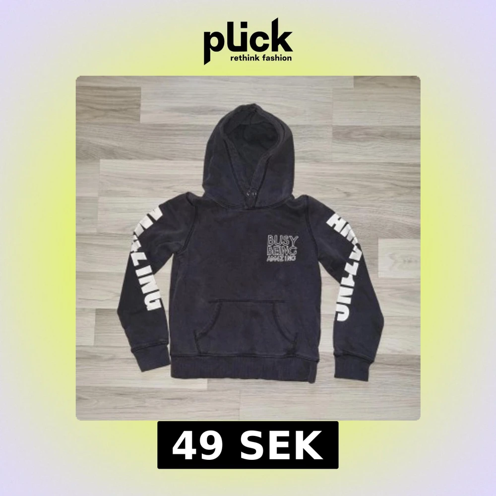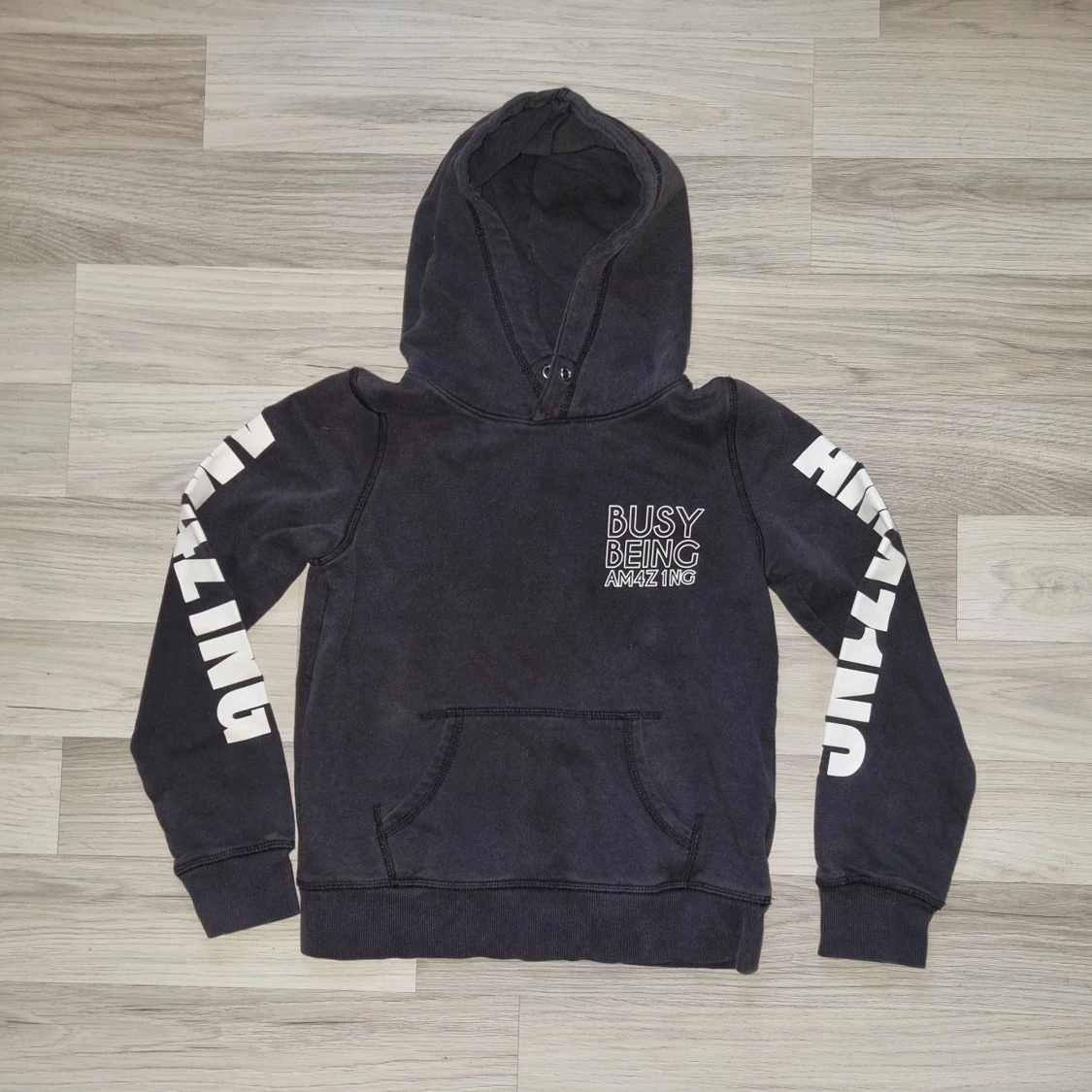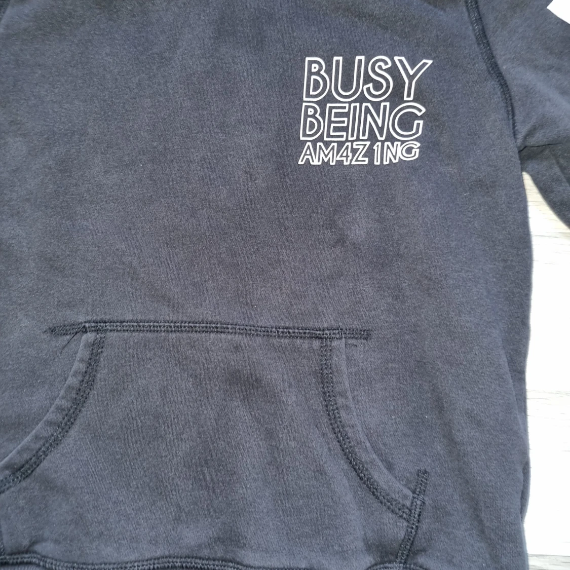 Säljer en svart hoodie från H&M med texten 'Busy Being Amazing' tryckt på bröstet och ärmarna. Tröjan har en klassisk känguruficka och en bekväm huva. Perfekt för en avslappnad stil.