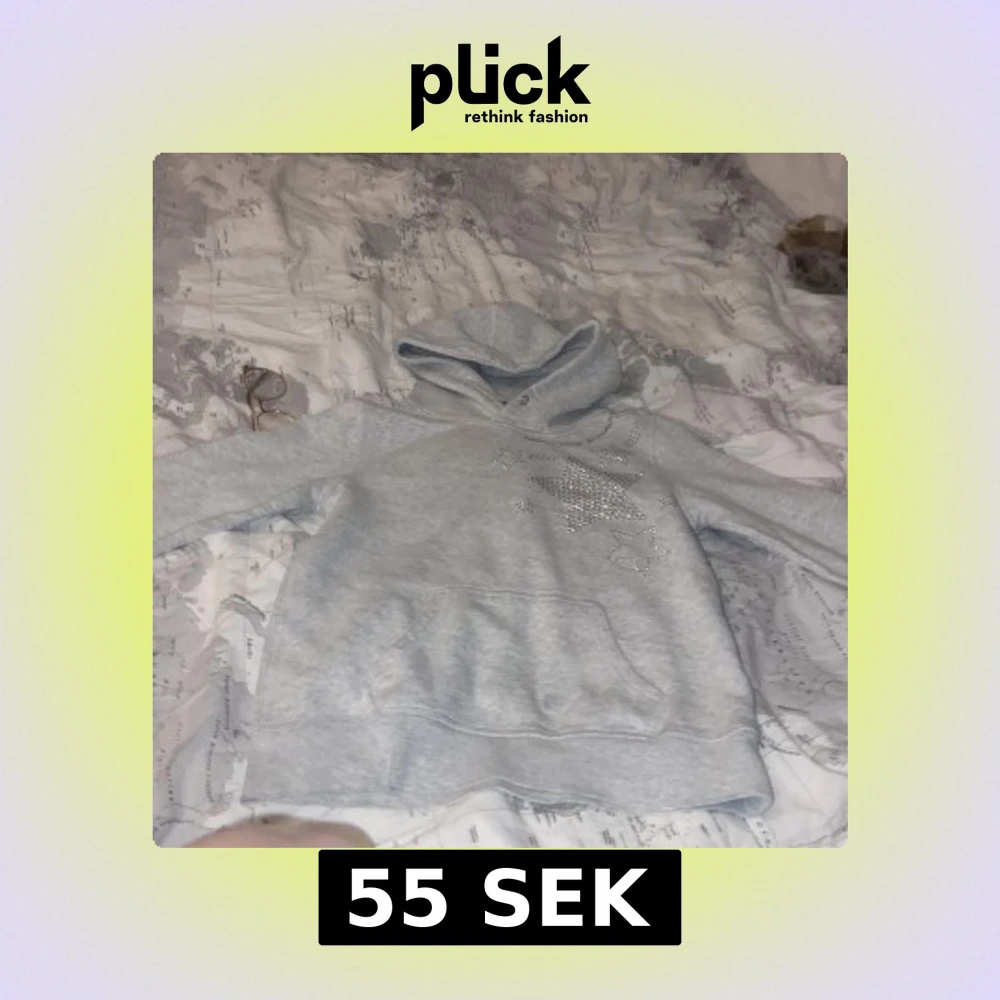 Säljer en ljusgrå hoodie från H&M med glittriga stjärnor framtill. Tröjan har huva och en stor magficka. Perfekt för dig som gillar en enkel men ändå lite extra look. Har en liten fläck på fickan men syns knappt.