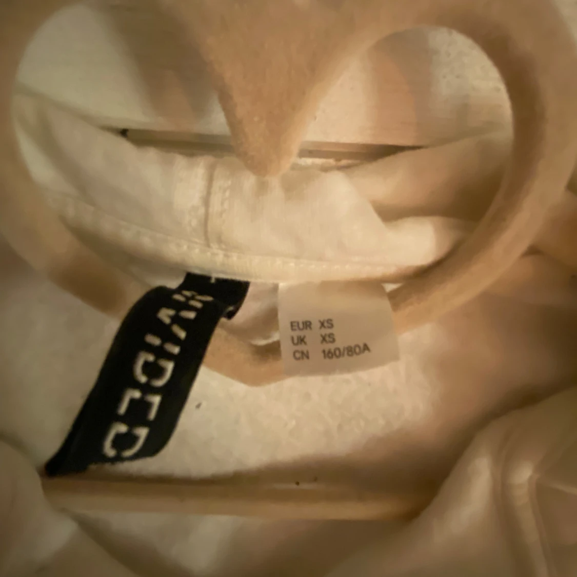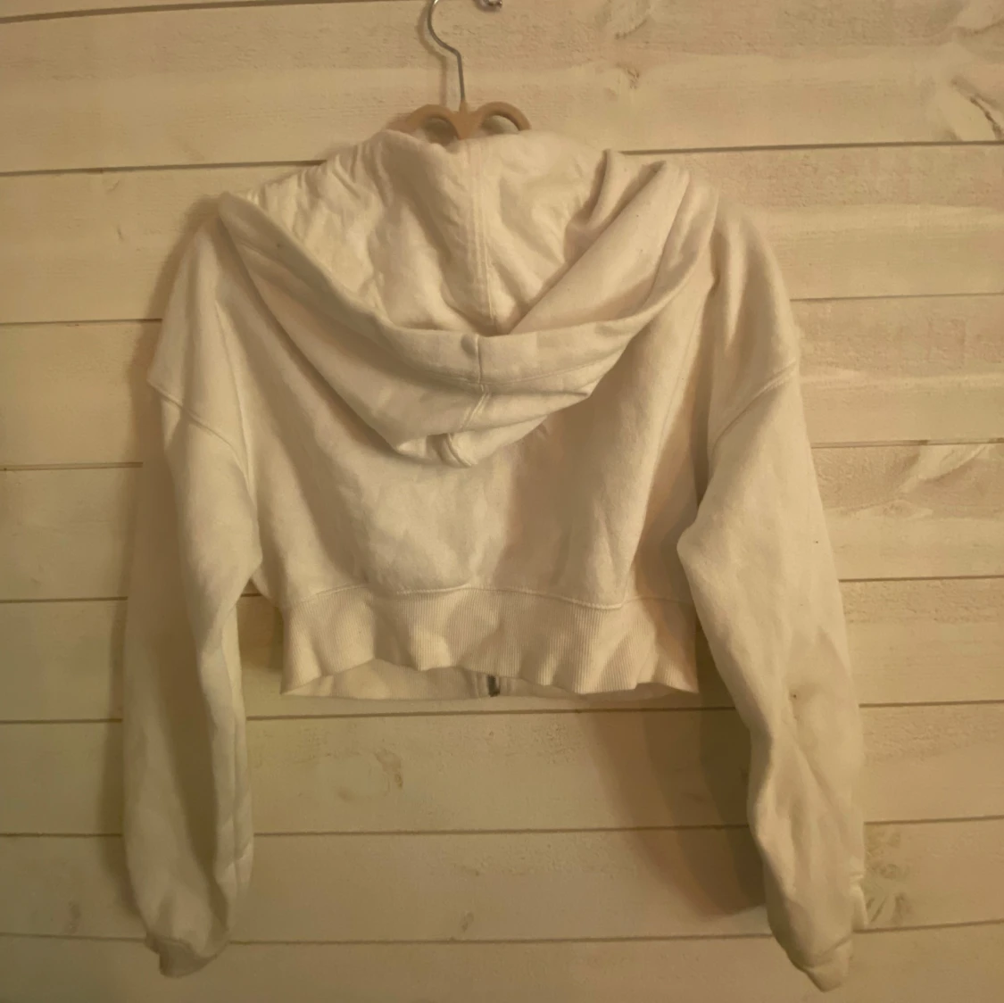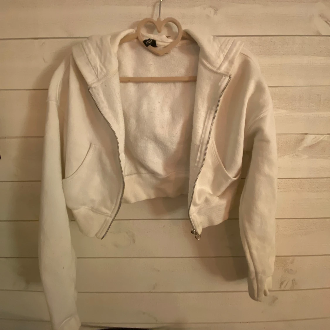 Säljer en vit croppad hoodie från H&M med dragkedja och huva. Den har långa ärmar och är perfekt för en avslappnad stil. Hoodie är i en mjuk och bekväm bomullsmix.