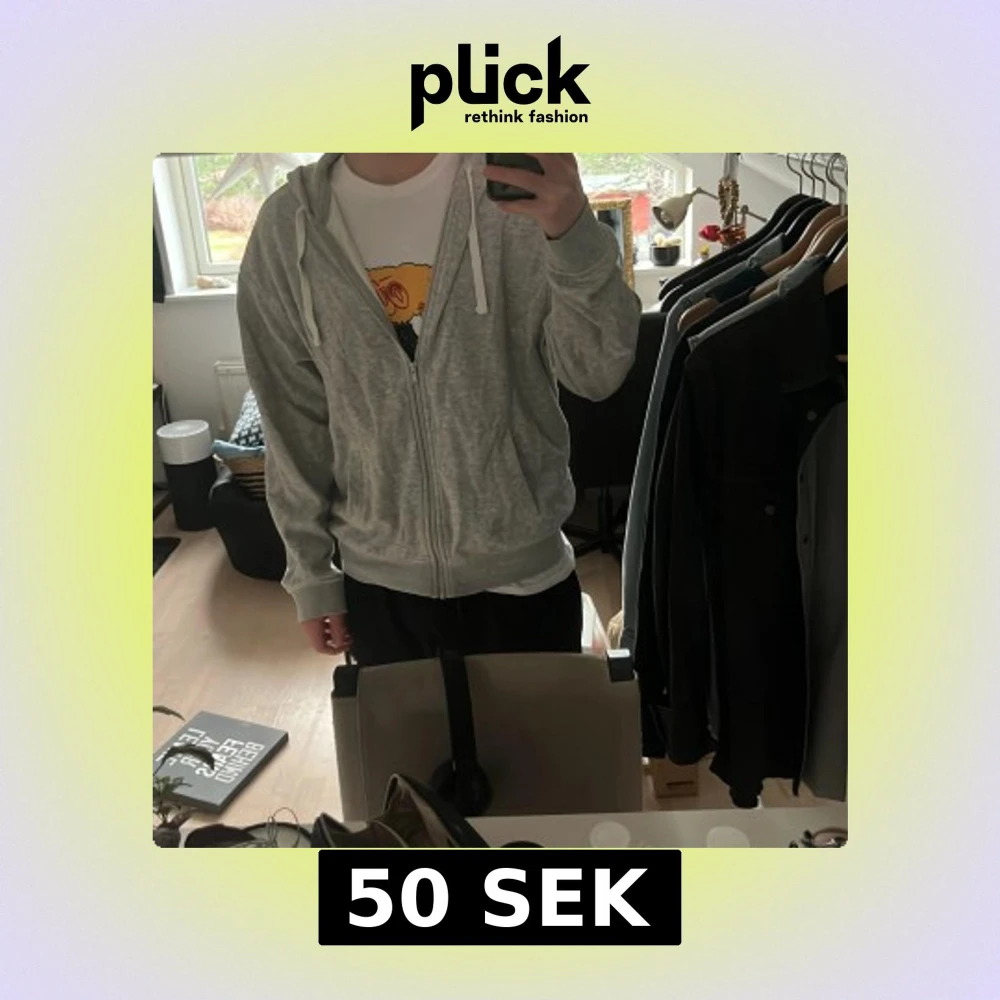 Säljer en grå huvtröja från H&M i relaxed fit. Tröjan har dragkedja och en praktisk huva med vita snören. Perfekt för en avslappnad stil.