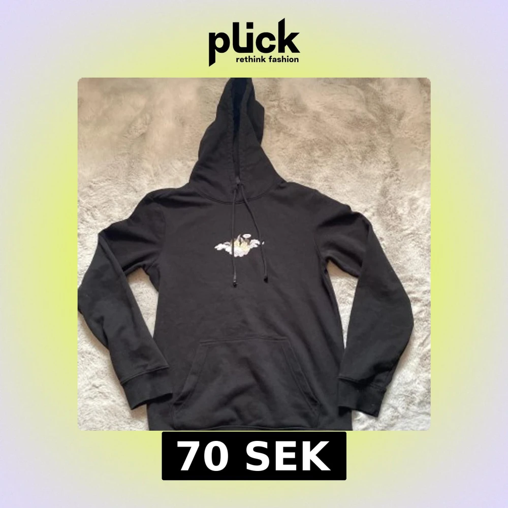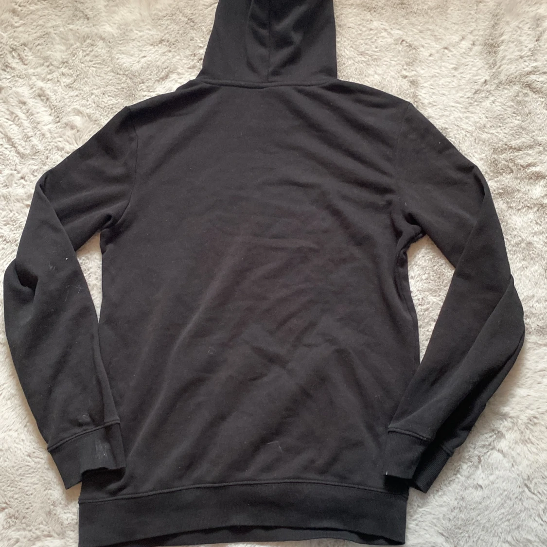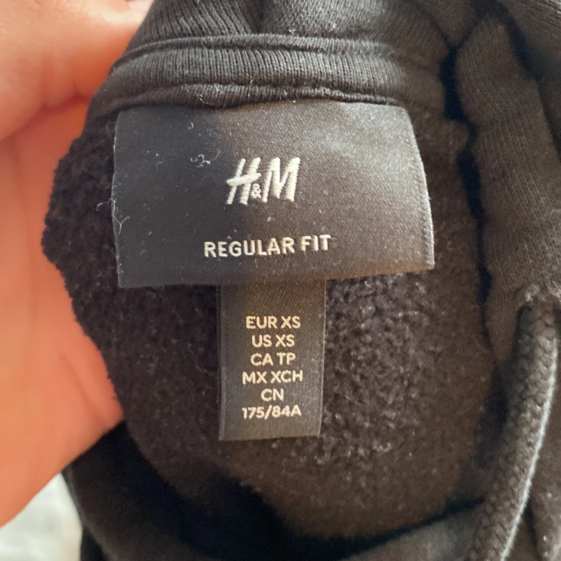 Säljer en svart hoodie från H&M i storlek XS. Tröjan har en justerbar huva med dragsko och en liten broderad detalj på bröstet. Perfekt för en avslappnad stil. Enda defekten är snörena som är lite sönder men går säkert att fixa.