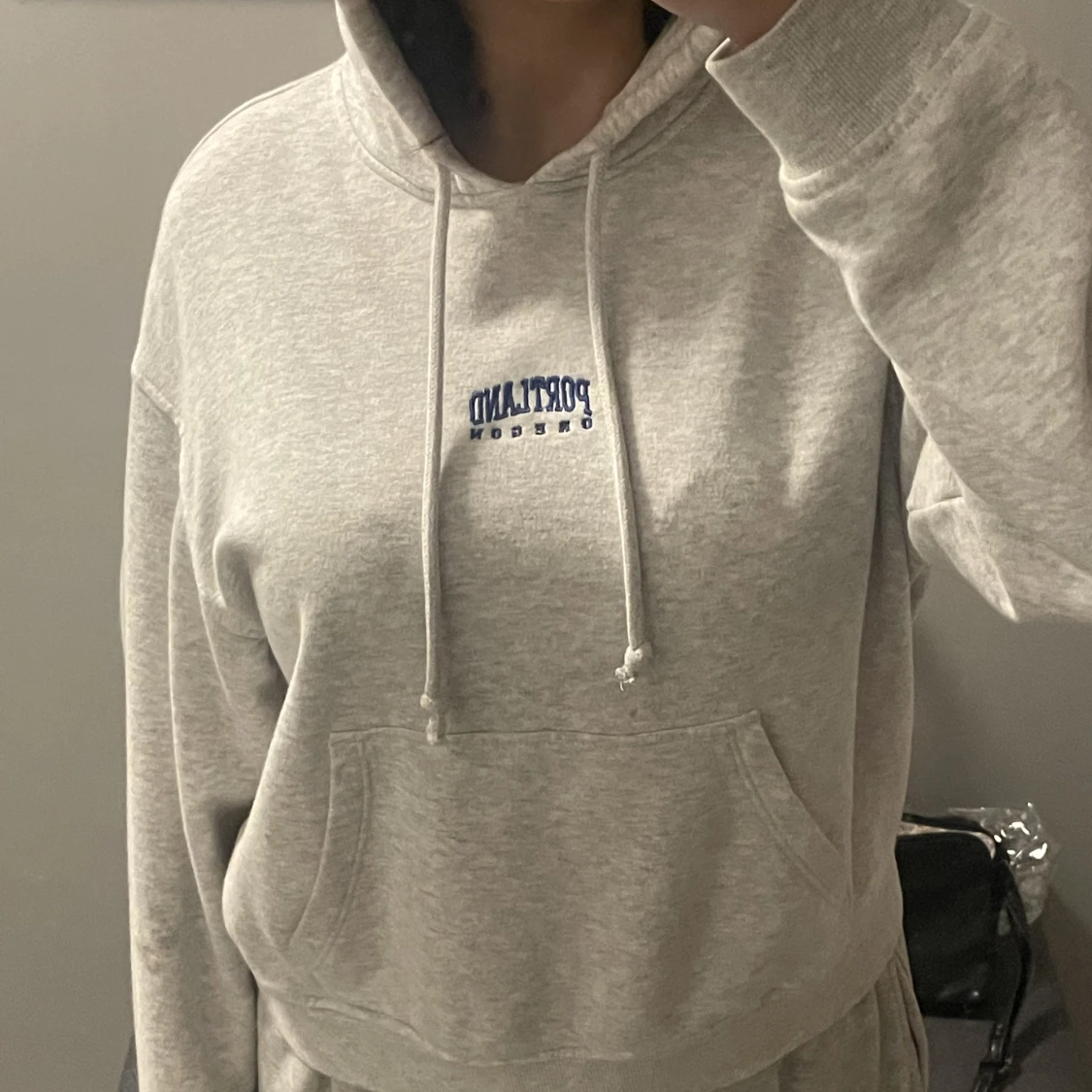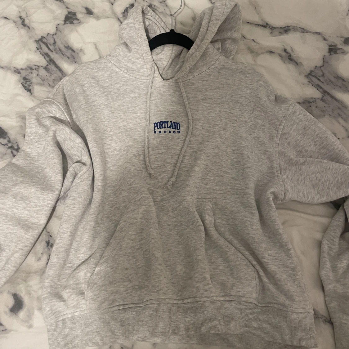 En skit skön grå hoodie med jätte mjukt material på insidan med trendig blå text. Säljs pga att den blivit för liten för mig
