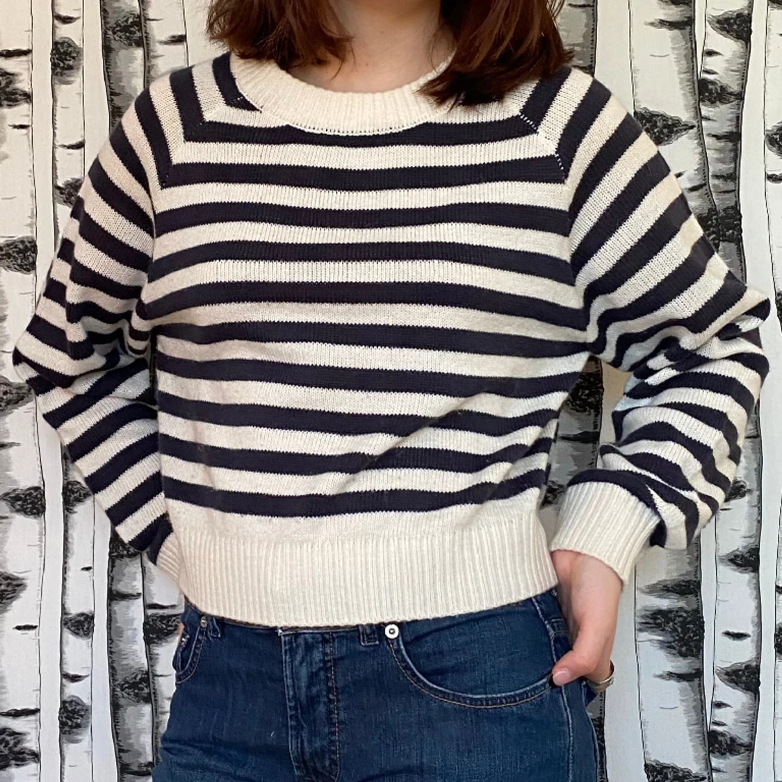 Randig tjockare tröja från hm. Lite croppad i både vit och marinblå. Perfekt till våren och kyligare sommarkvällar 💕😍