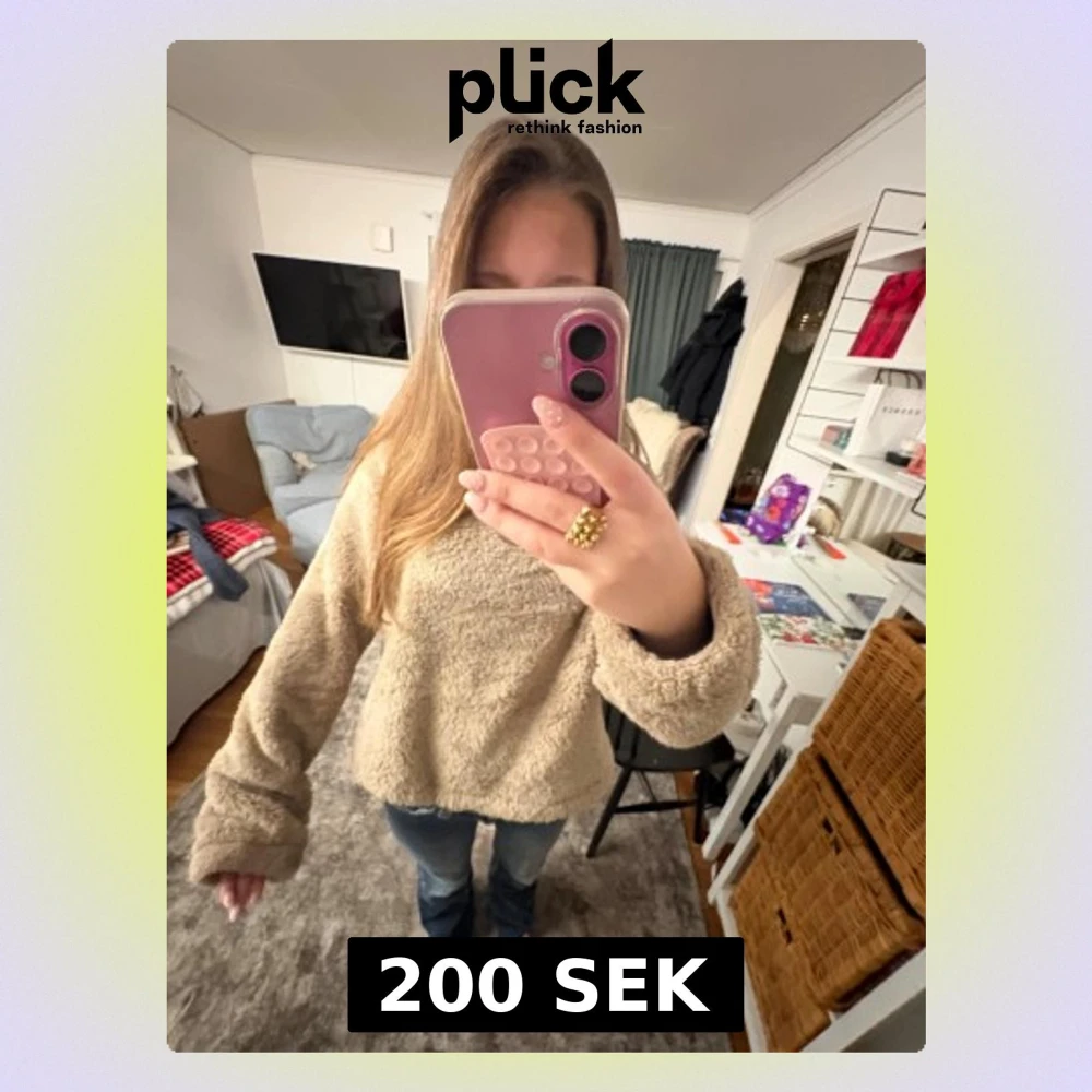 Supermysig beige hoodie från H&M i storlek M. Tröjan är fluffig och har en huva, perfekt för kalla dagar. Den har långärmade ärmar och en loose passform som ger en chill vibe. Materialet är mjukt fleece och färgen är neutral beige.