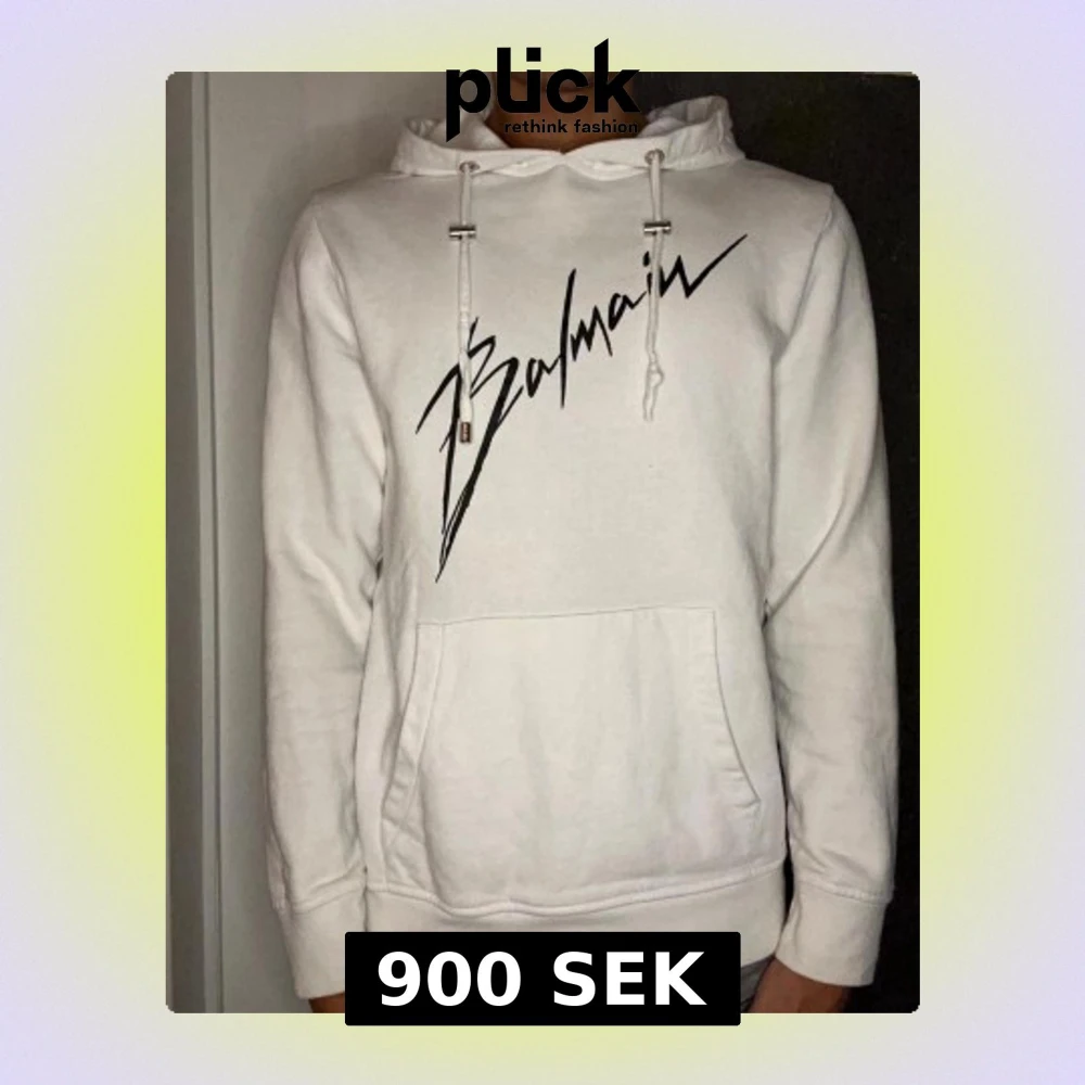 Säljer en vit hoodie från Balmain med stor svart logga i grafisk stil över bröstet. Hoodien har huva med dragsko och en klassisk magficka framtill. Tillverkad i mjukt material som känns skönt mot huden. Perfekt för en clean och trendig streetwear-look. Hoodien har dragkedja på båda sidorna som är halvvägs upp