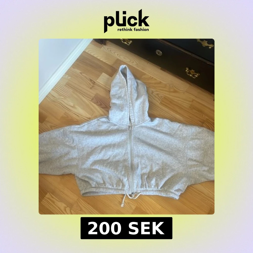 Säljer en grå croppad hoodie med dragkedja och huva. Tröjan har en avslappnad passform och ribbade muddar vid ärmslut. Perfekt för en casual look!