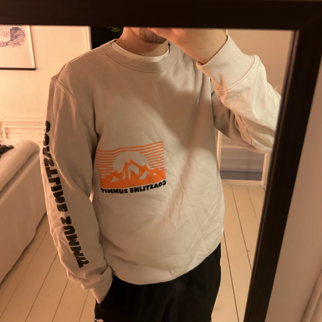 En snygg sweatshirt med tryck på framsidan och ärmarna.