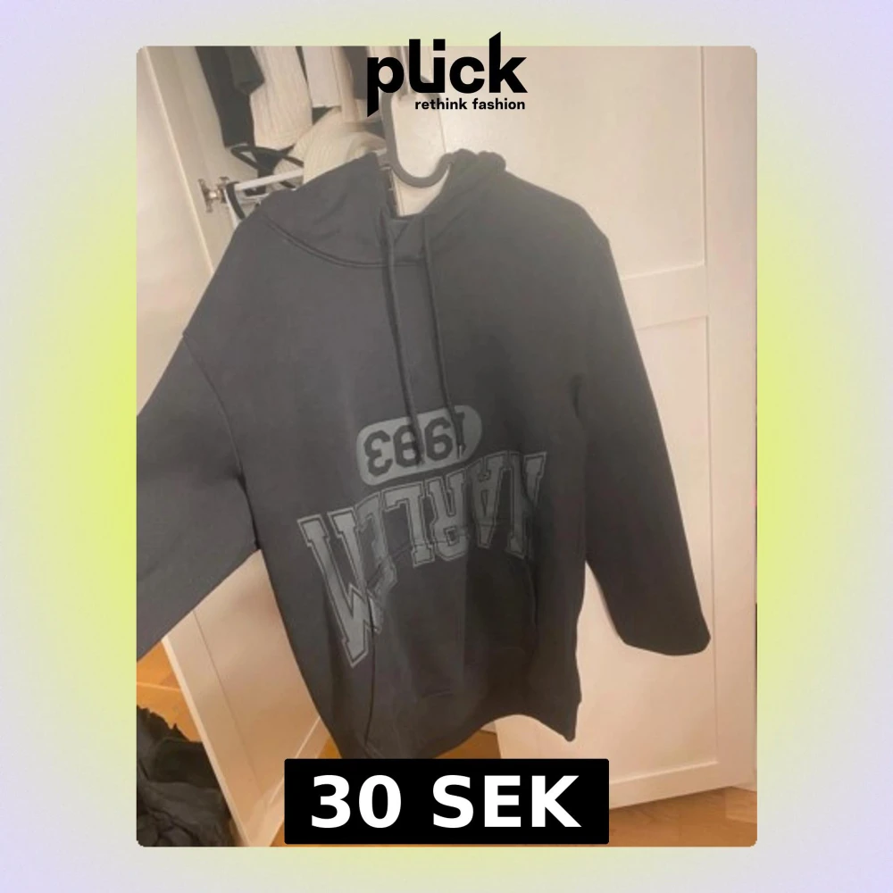 Svart hoodie från H&M i regular fit med stort tryck på framsidan där det står 'HARLEM 1983' i grått. Tröjan har huva med snörning och långa ärmar. Perfekt för dig som gillar streetstyle och vill ha en chill look.