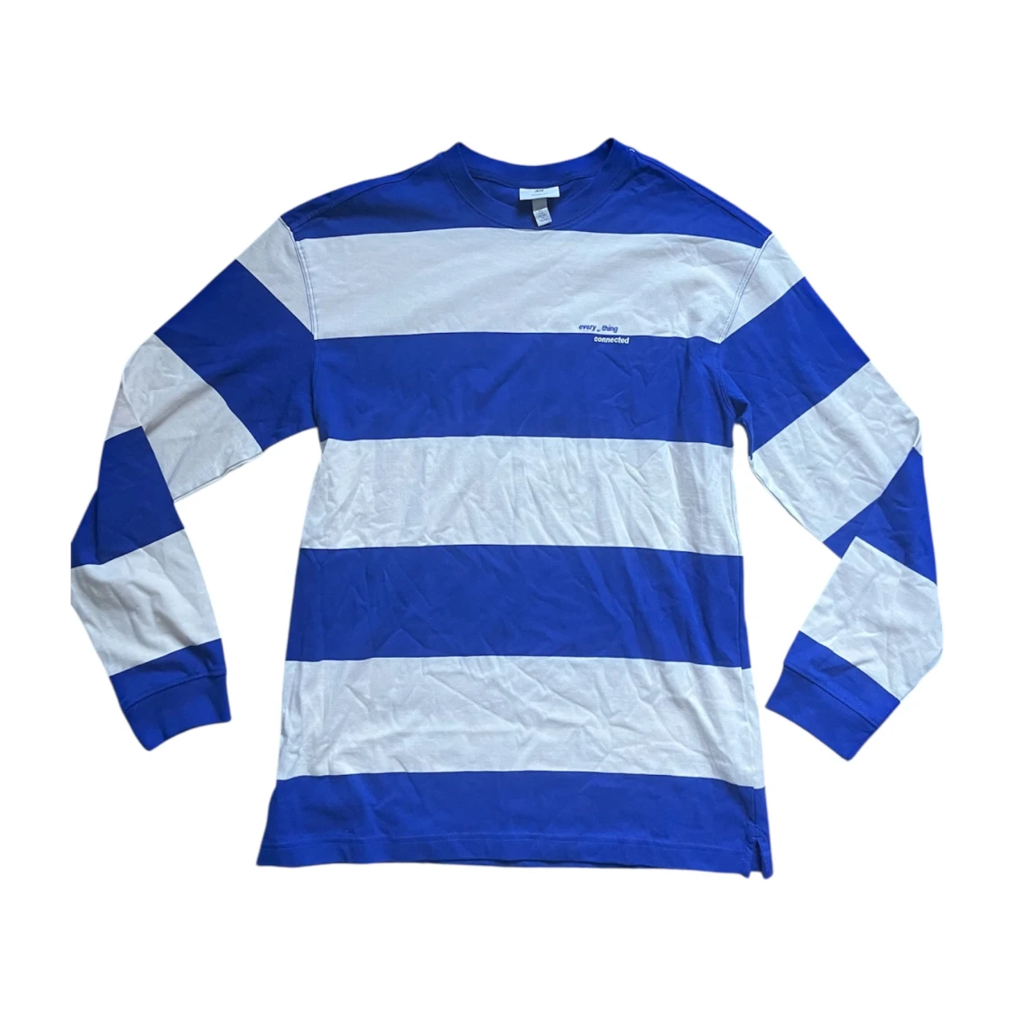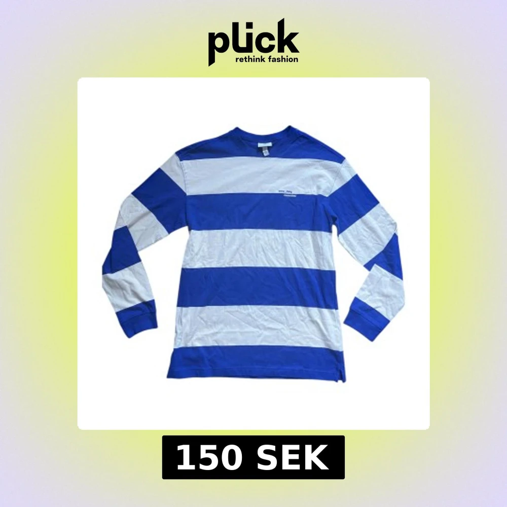 Säljer en långärmad tröja från H&M med breda blå och vita ränder. Tröjan har rund halsringning och är tillverkad i mjuk bomull. Perfekt för dig som gillar en sportig och avslappnad stil.