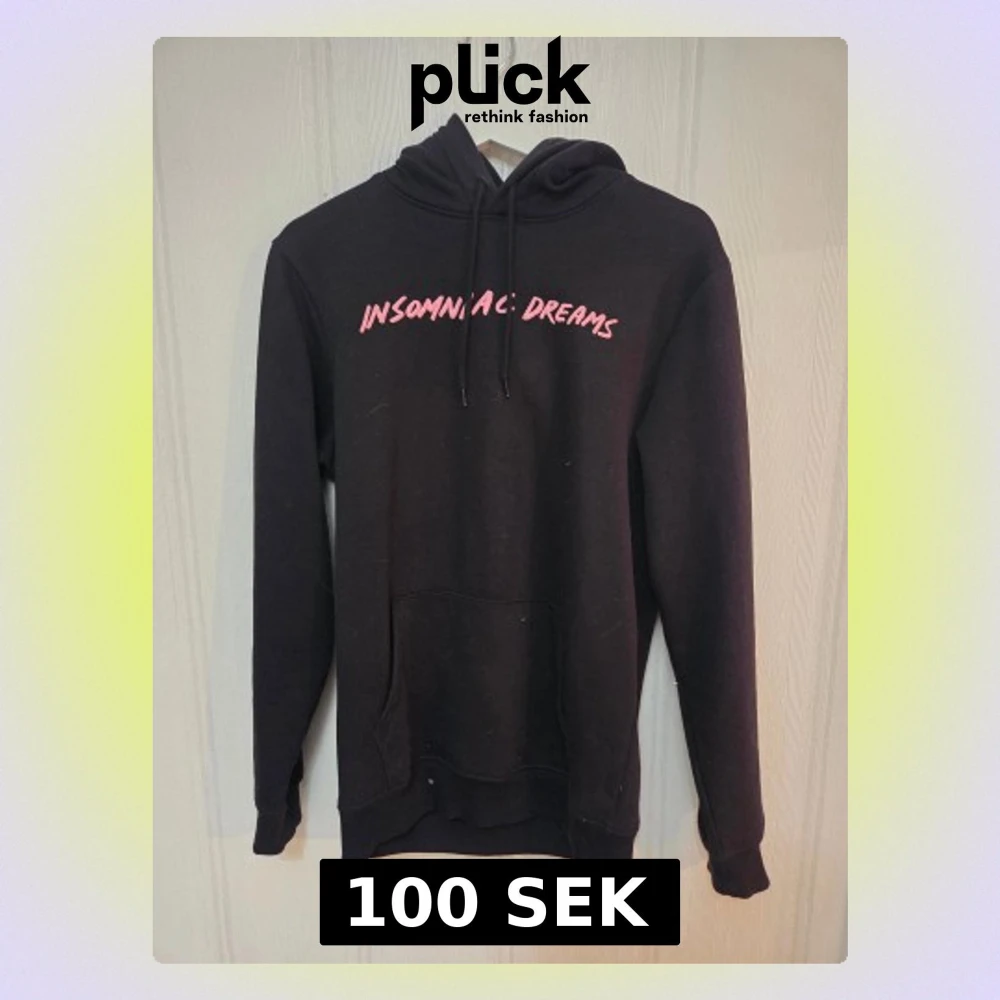 Svart hoodie från HM med rosa text 'INSOMNIAC DREAMS' på bröstet och en stor grafisk print på ryggen. Tröjan har huva med snörning och en klassisk magficka.