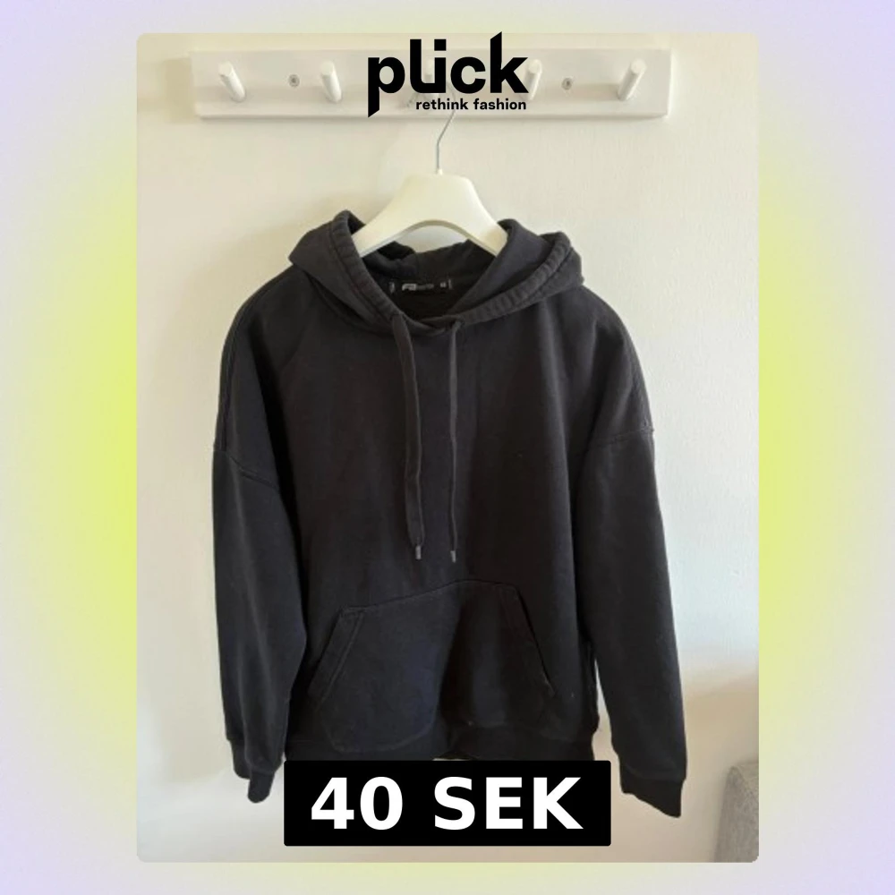 En svart hoodie från FBsister med en stor ficka fram och dragsko i huvan. Den är i storlek XS men har en oversized passform, så den passar både killar och tjejer.